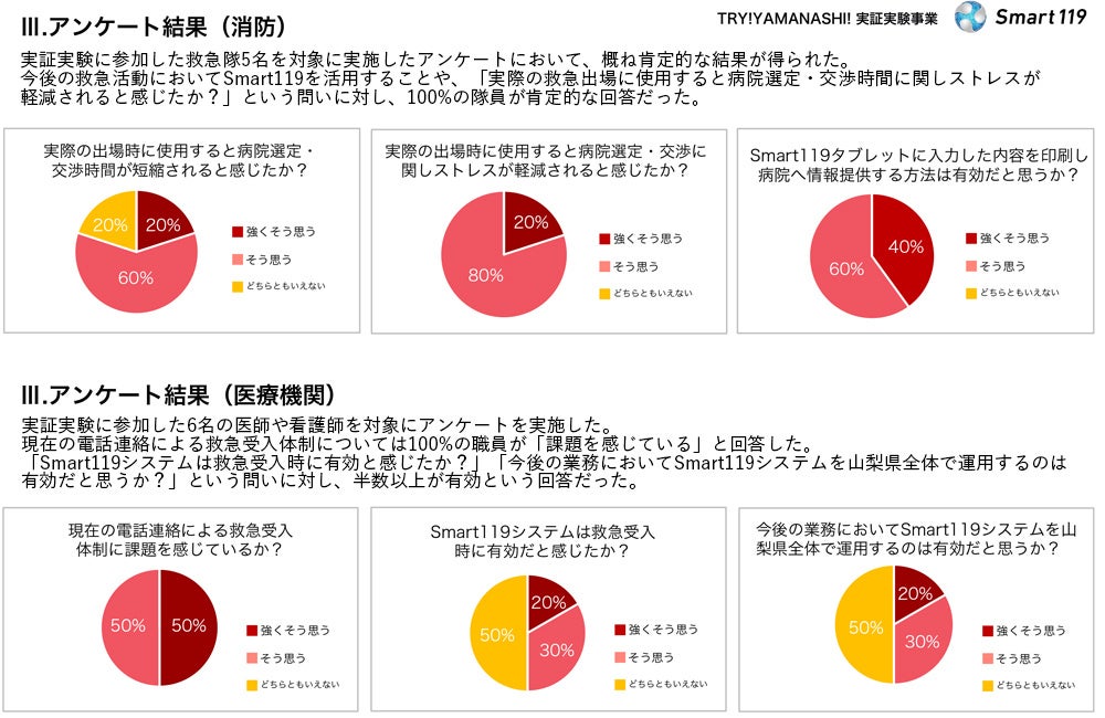 数値、アンケート結果などから、救急救命時の傷病者情報を救急隊と医療機関で共有する本システムは、搬送困難の解決に有望であり、山梨県民の暮らしの安全安心に貢献するものと認識されました。