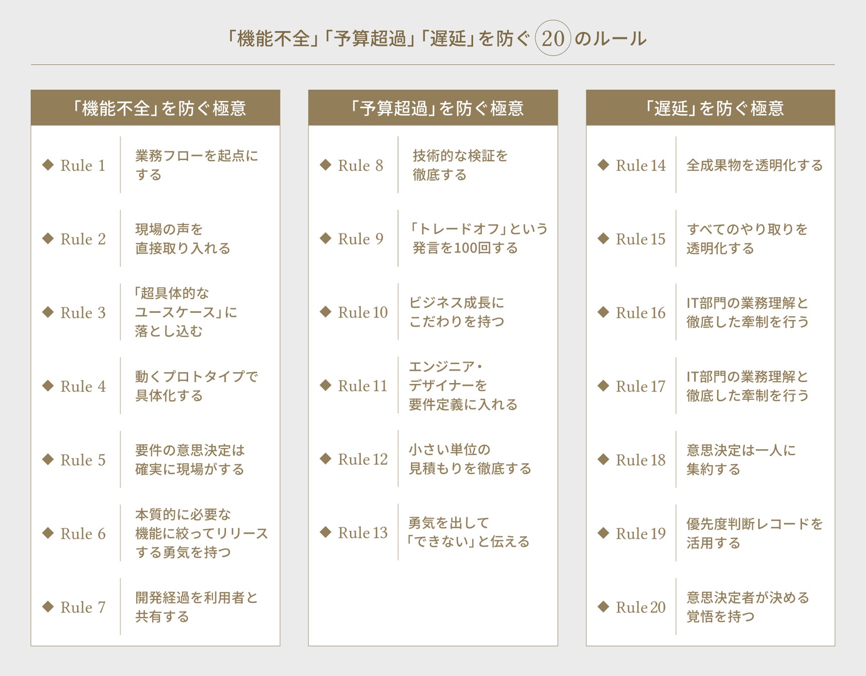 本書では、要件定義を成功に導くための実践的なノウハウを、「20のルール」として体系化しました。いずれも単なる理論ではなく、実際のプロジェクト経験から導き出された「実務者のための原則」であり、現場でそのまま活用できる具体的な行動指針としてまとめています。