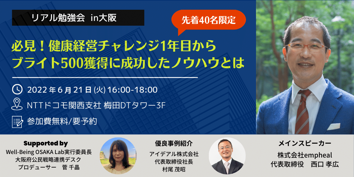 健康経営の支援プログラムを提供する株式会社empheal(エンフィール)(本社:東京都千代田区、代表取締役社長:西口 孝広、株式会社NTTドコモとエムスリー株式会社の合弁会社)は、大阪府が運営するWell-Being OSAKA Labと共催で健康経営をテーマにしたリアル勉強会を、梅田DTタワー3Fにて開催いたします。