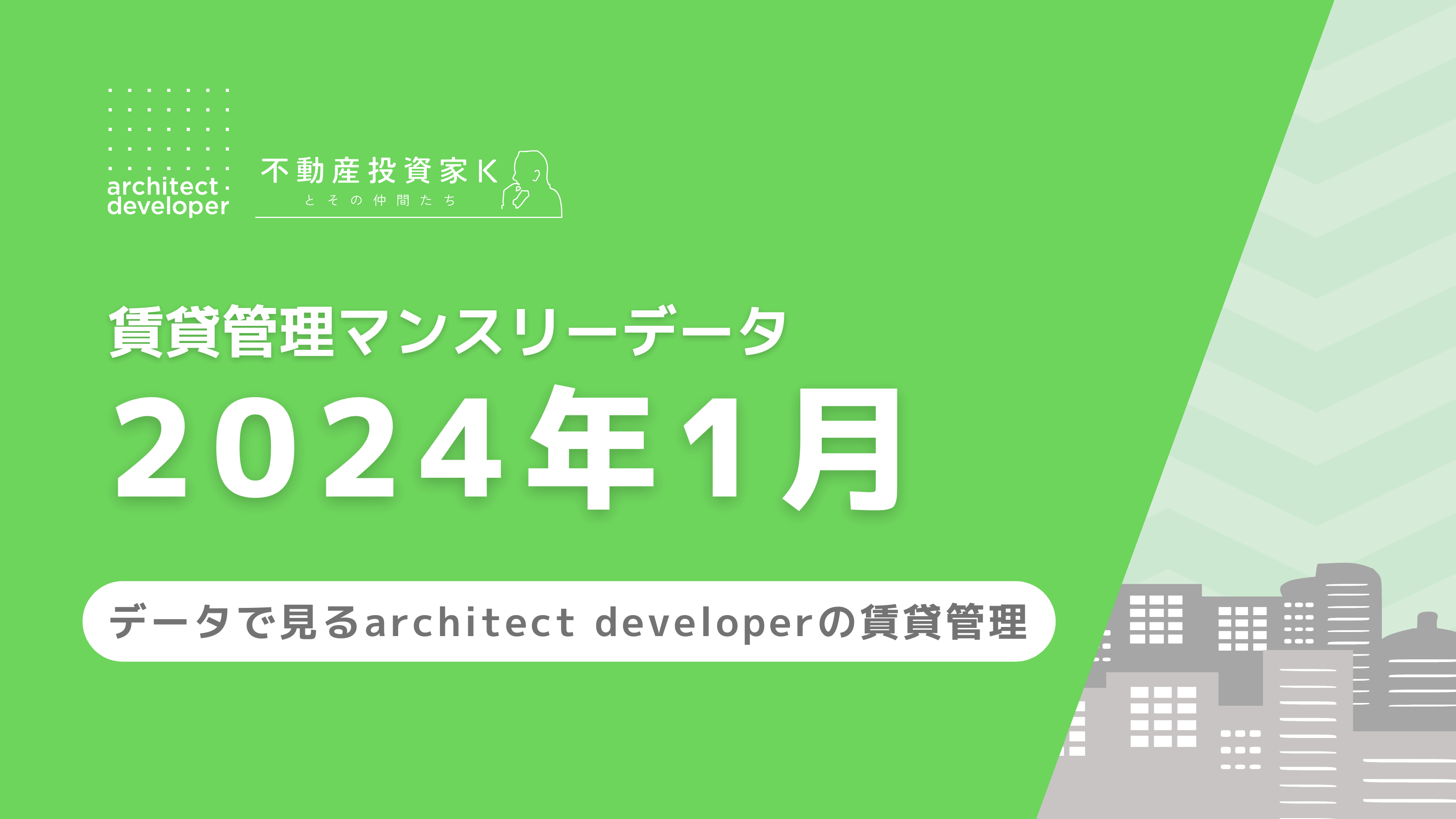 architect developerが管理している集合住宅の賃貸管理状況を、毎月20日頃に「マンスリーデータ」として配信しています。賃貸管理データを定期的に公開することで事業の透明性を高め、オーナーさまや投資家の皆さまをはじめとする多くのステークホルダーの皆さまに、当社の事業内容や取り組みを知っていただく機会としていただければと考えております。より詳しいマンスリーデータ(2024年1月)は、不動産投資メディア「不動産投資家Kとその仲間たち」よりご確認いただけます!