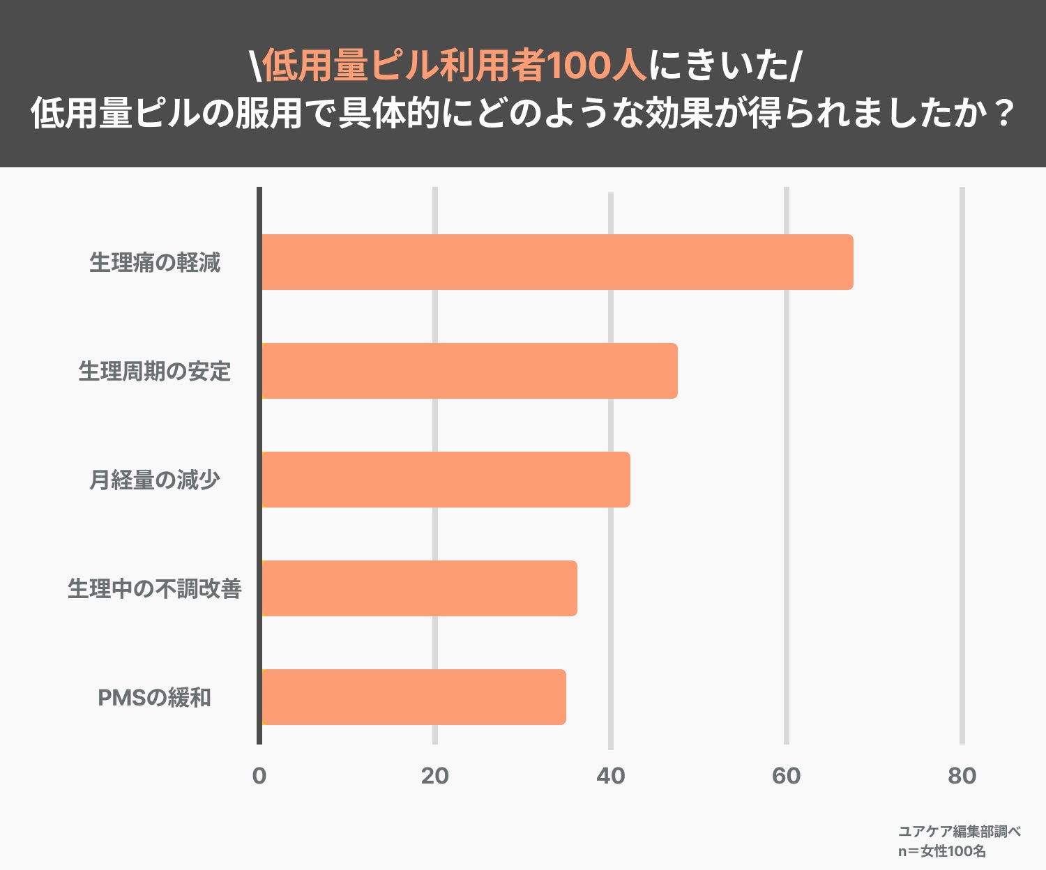 生理に関する症状で悩まされている多くの女性が、低用量ピルを服用することで症状の改善を実感。生理痛の軽減や、気持ちが安定することにより、服用前よりも晴れた気分で生活ができるようになったと多くの方が回答しています。症状の改善以外でも、生理周期を整えることができることにありがたみを感じている人が多くいました。