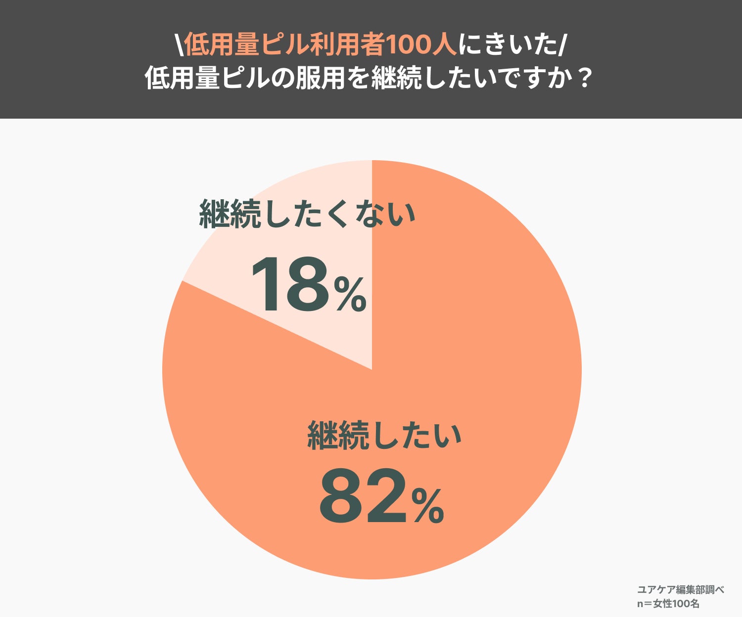 アンケート回答者に、「低用量ピルの服用を継続したいですか?」と聞いたところ、82%の方が「継続したい」と回答しました。一方で、18%の方が「継続しない」と回答しています。