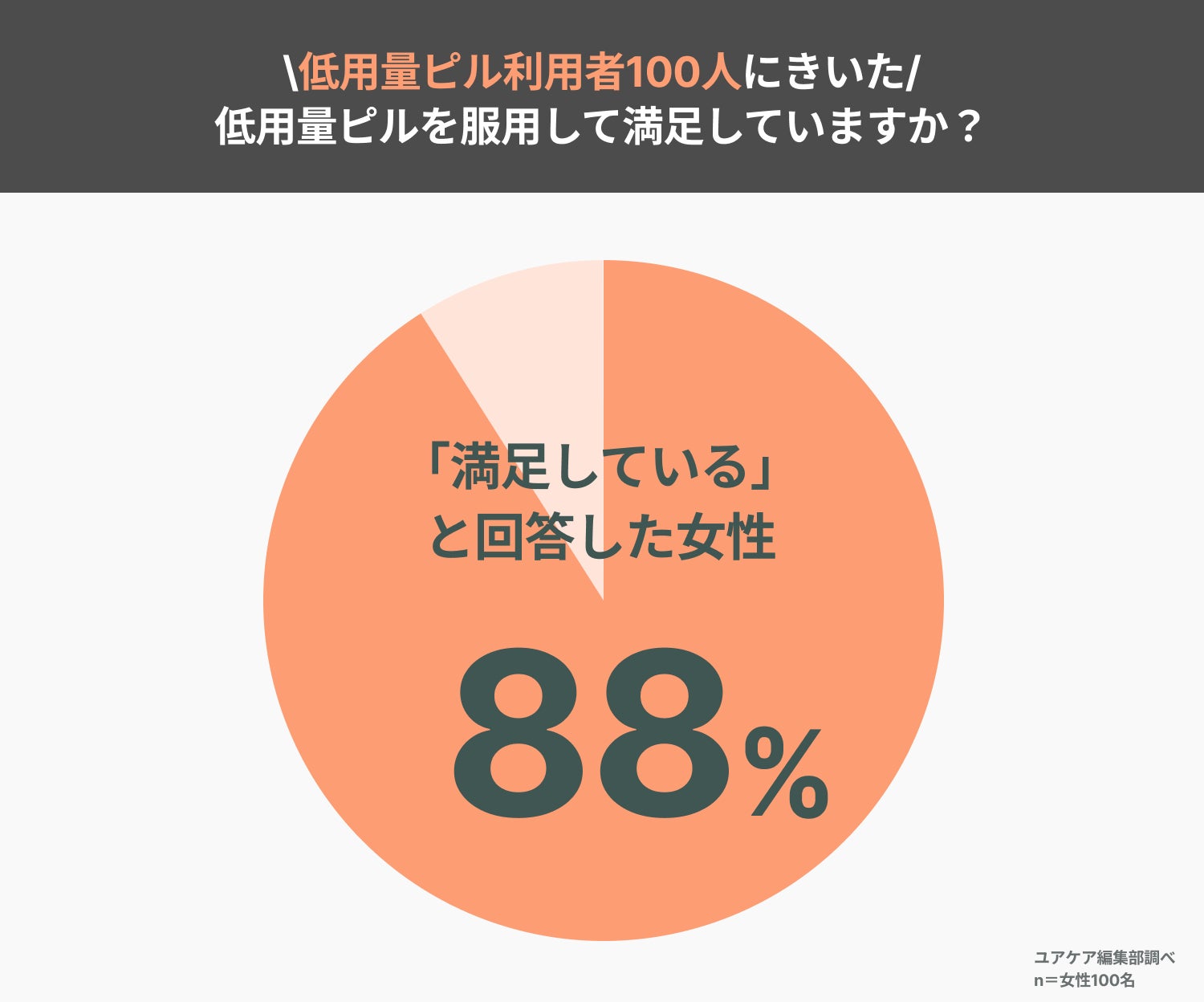 アンケート回答者に「低用量ピルの効果に満足していますか?」と聞いたところ「満足している」と回答した人が88%を占めました。