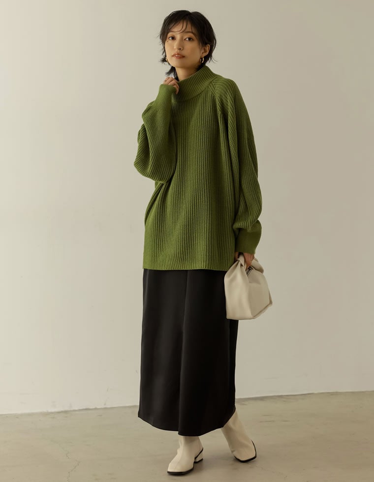 鮮やかなケリーグリーンが人気だった春夏から一転して、2022年の秋冬は、より抜け感のある優しいトーンの淡いグリーンに注目。シアー素材のトップスや、ワンピースなど軽やかな質感のアイテムと好相性。シンプルなアイテムに合わせるだけでも、ぱっと映える着こなしに。