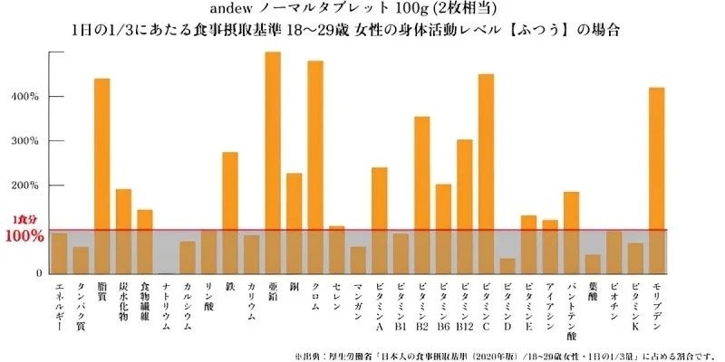 下表は、andew ( 1枚50g )2枚に含有している各栄養素の成人女性の1日の基準量に対する割合を示したものです。