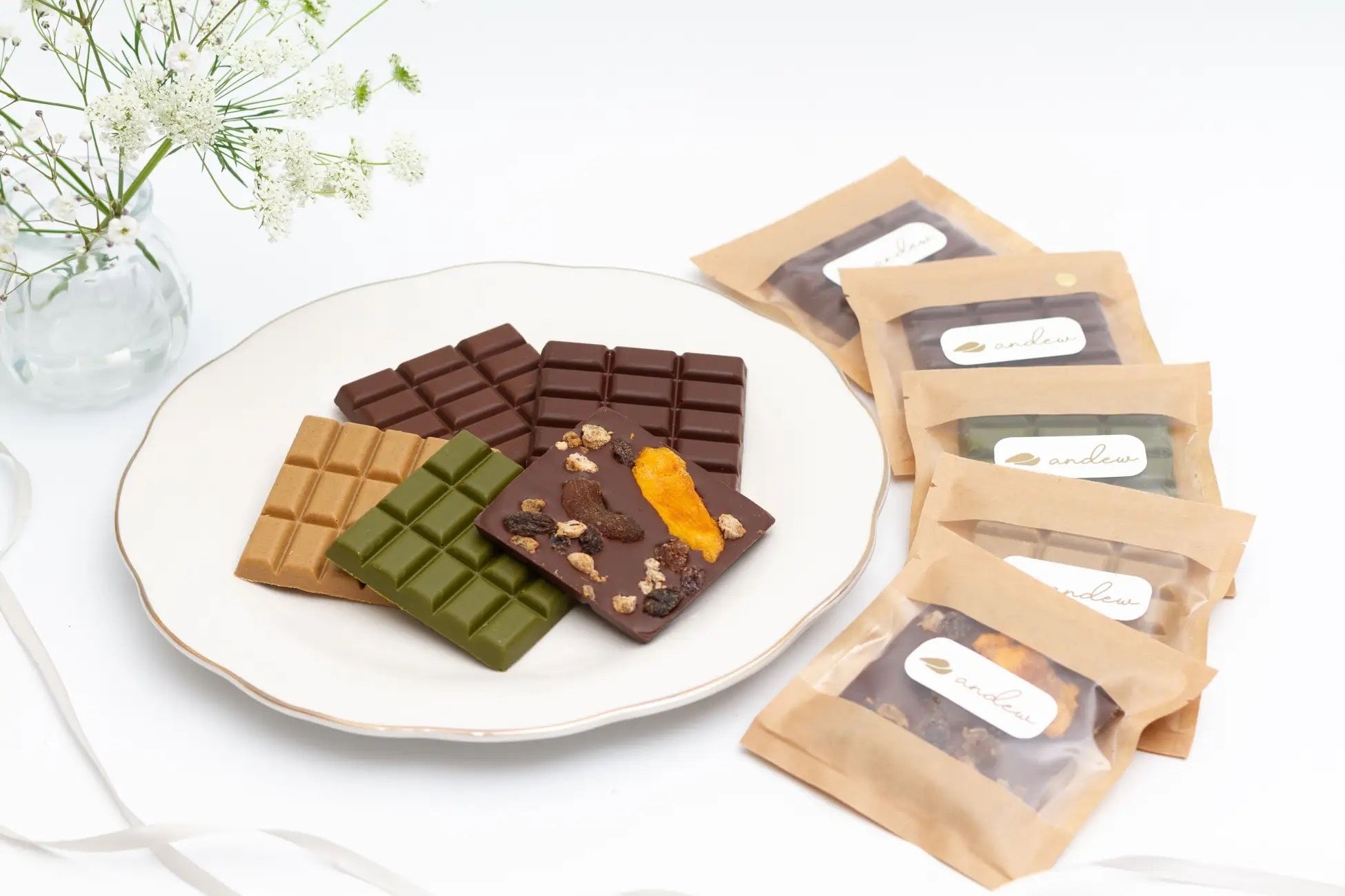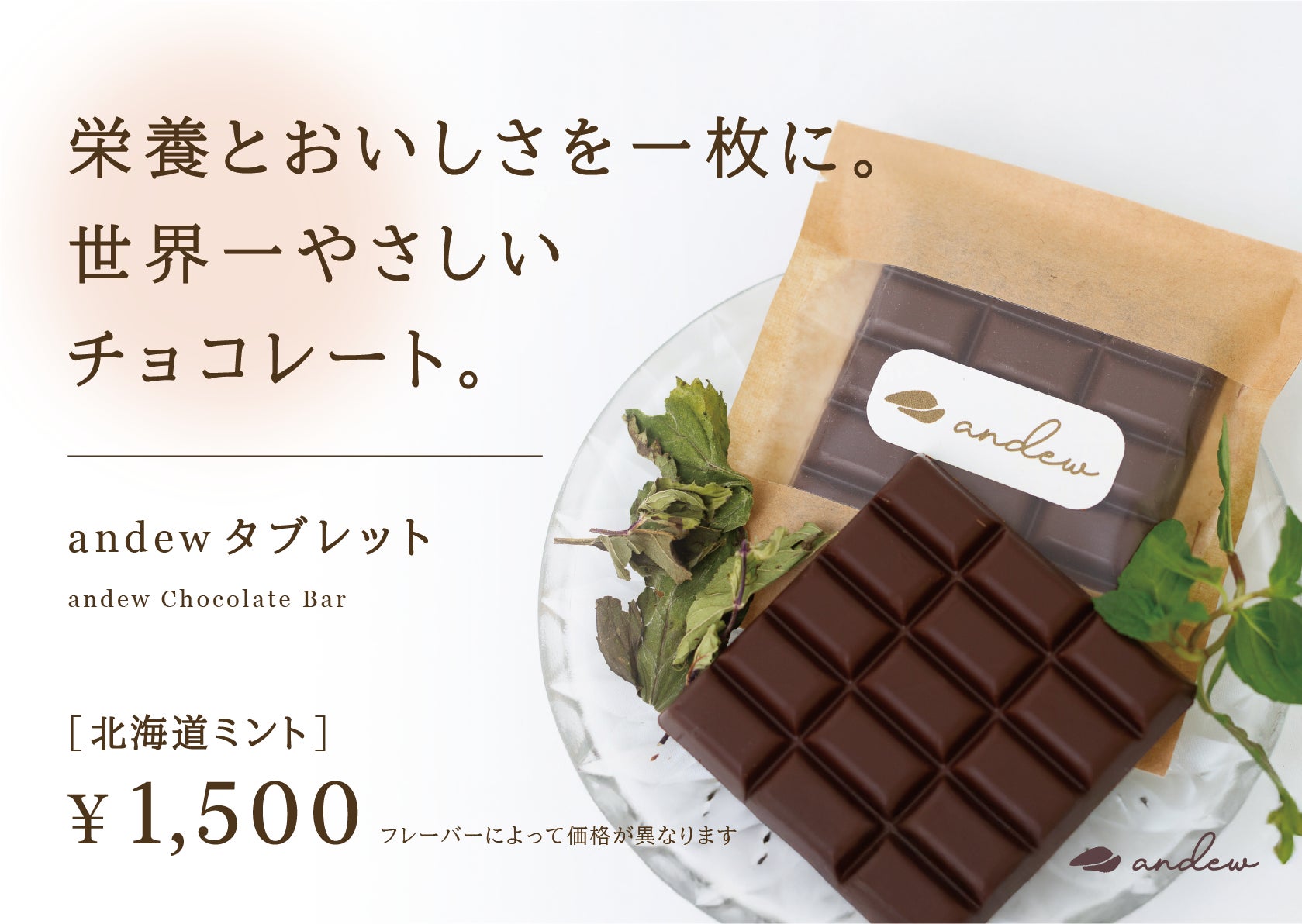 andewは、チョコレートの原料のカカオ豆に加え、アーモンド、きな粉、チアシード、ココナツ、ケシの実、抹茶、 昆布などの栄養たっぷりの食材をふんだんに使用し、栄養価を最大まで高めた世界初の完全食チョコレート。