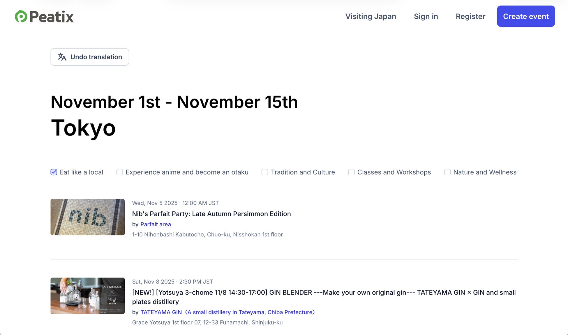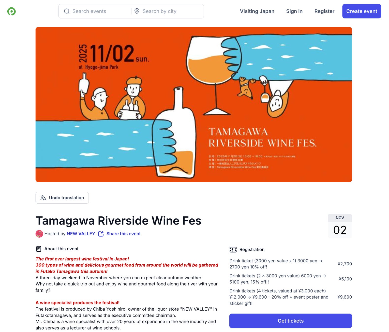 掲載されるイベント情報は、ピーティックス( https://peatix.com )の掲載情報と連動しており、日本国内の主催者がピーティックスに登録したイベントページの内容が反映されます。特別な手続きや準備は必要なく、ピーティックス上でイベントページを作成すれば「Visiting Japan」を通じたインバウンド集客が可能になります。