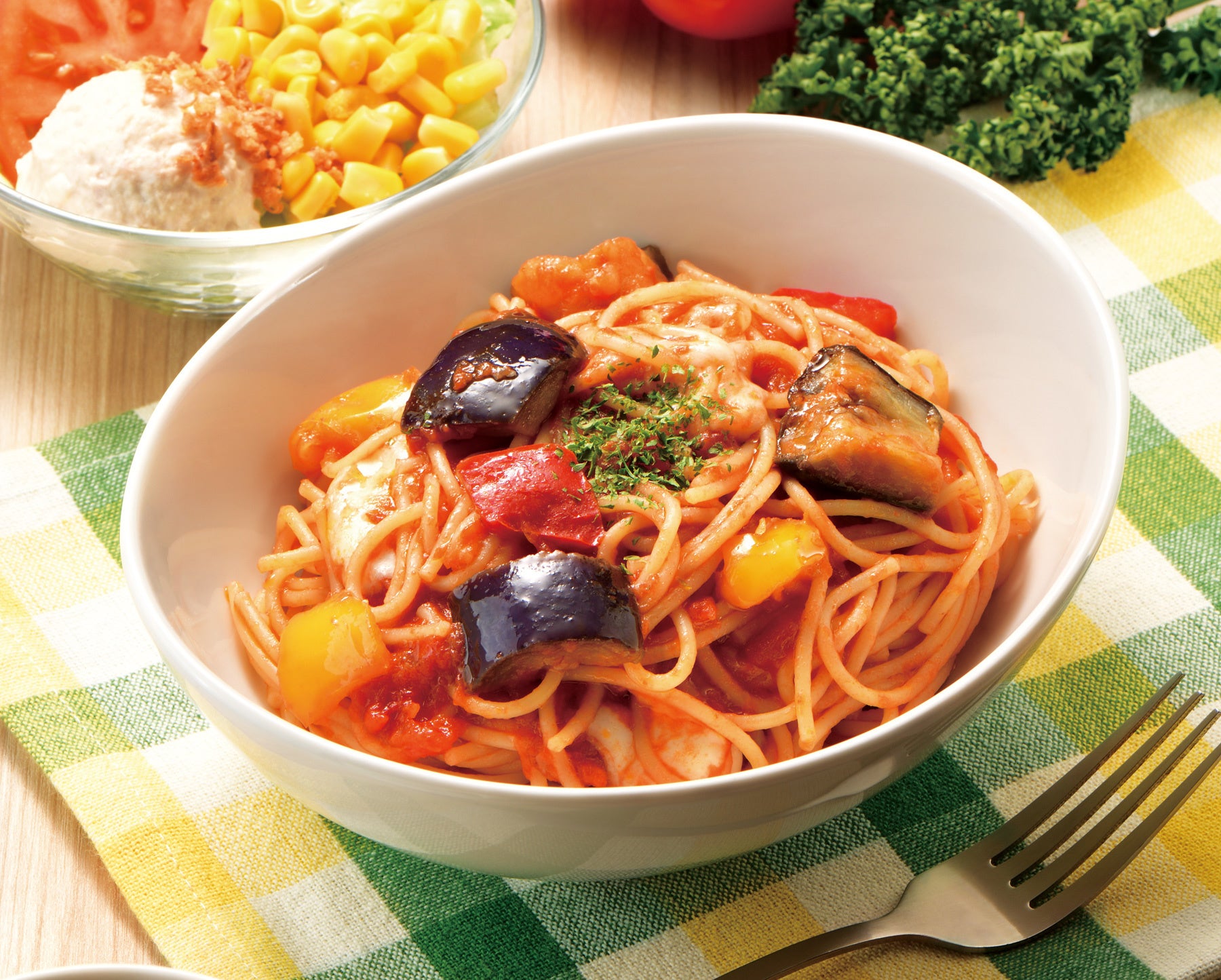 フードメニュー「パスタ 彩り野菜とモッツァレラのトマトソース」は、しっかり煮込んだトマトの旨みと、フレッシュトマトのような爽やかな酸味、2つのトマトの味わいが感じられるカフェ・ド・クリエオリジナルのトマトソースパスタです。とろっととろけるまろやかな味わいのモッツァレラチーズに、揚げナス、赤と黄色のパプリカをあわせて彩り鮮やかに仕立てました。
