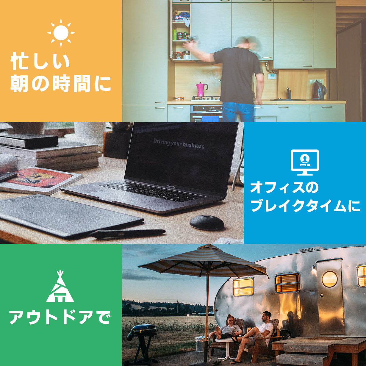 また、WITHコロナ時代の生活スタイルに合わせ、アウトドア(バッテリー内蔵)でも、室内(静音設計)両方で美味しく楽しめる仕様にしております。