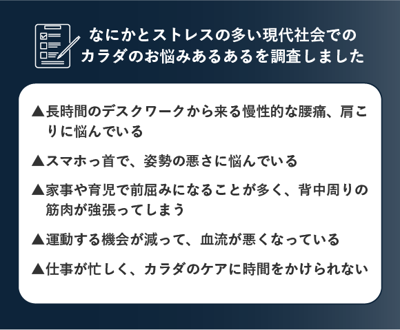 長時間のデスクワークやスマホ操作から起きる姿勢の悪さや血行不良にお悩みという方に特におすすめとなっております。