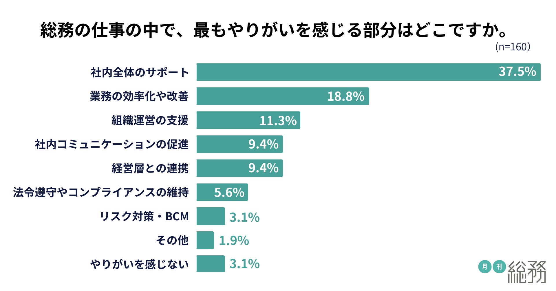 総務の仕事で最もやりがいを感じる部分については、「社内全体のサポート」が37.5%で最多、「業務の効率化や改善」が18.8%と続きました(n=160)。