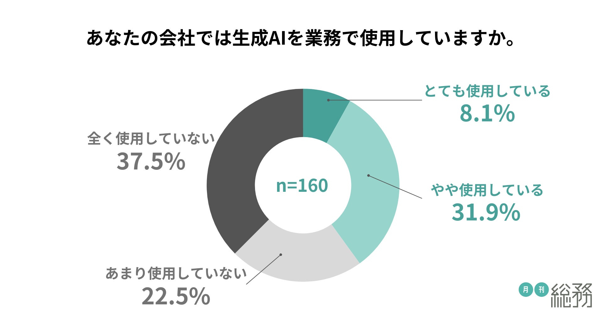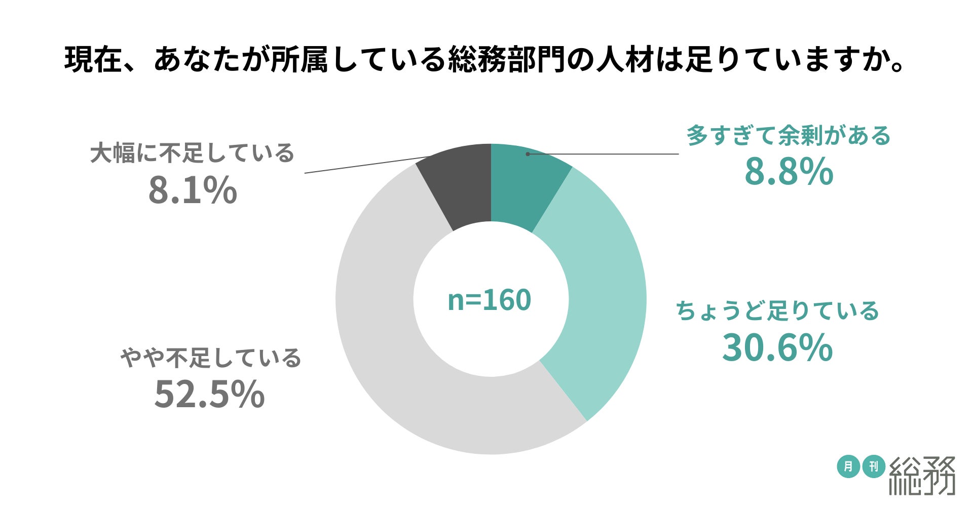 現在の総務部門の人材の充足状況について尋ねたところ、「大幅に不足している」と「やや不足している」が合わせて60.1%で、6割が「人員が足りていない」と感じていることがわかりました(n=160)。