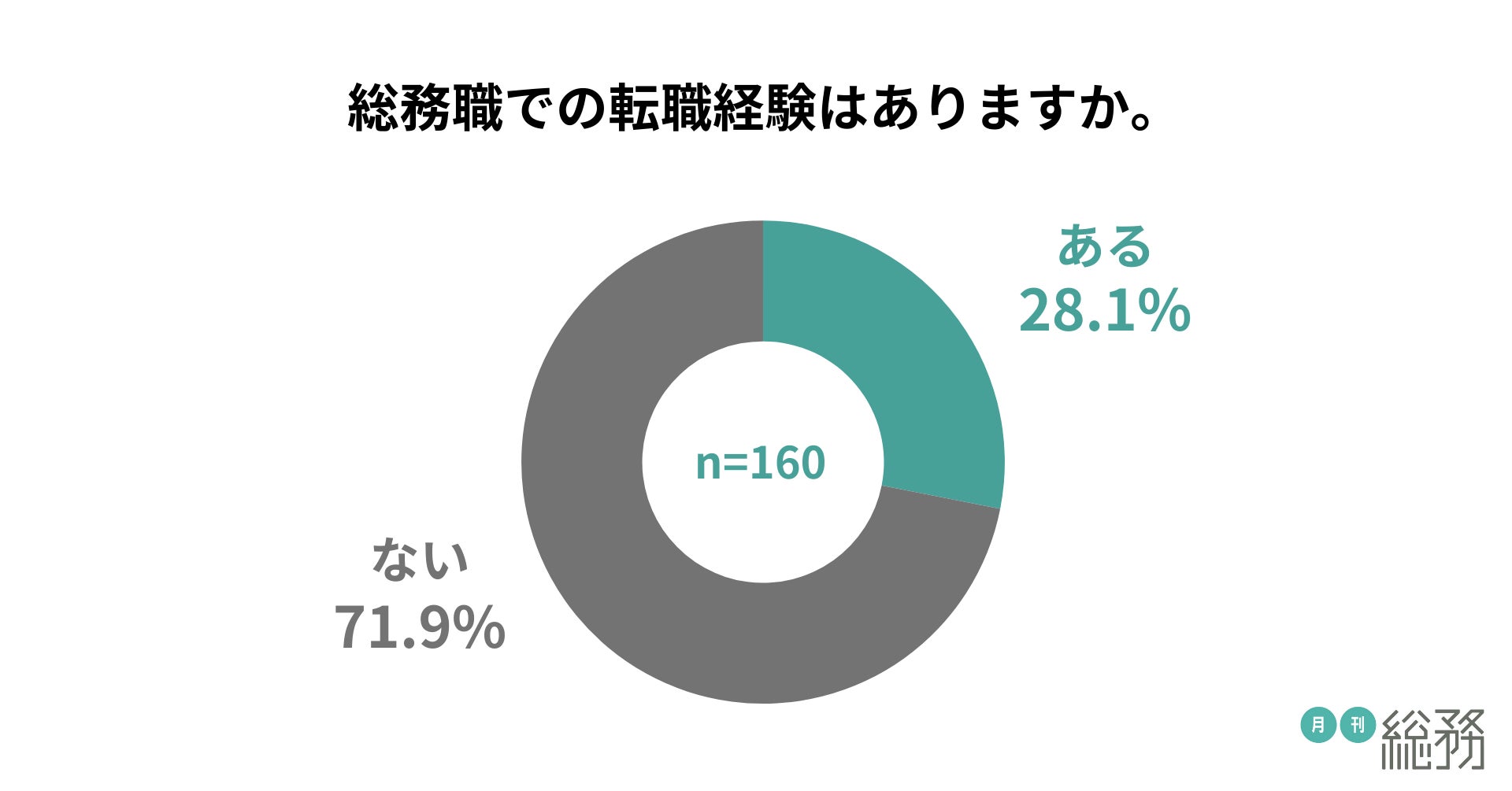 総務職として転職経験があるか尋ねたところ、「ある」と答えた人は28.1%、「ない」と答えた人が71.9%となりました(n=160)。総務職として長く同じ企業でキャリアを積む人が多いようです。