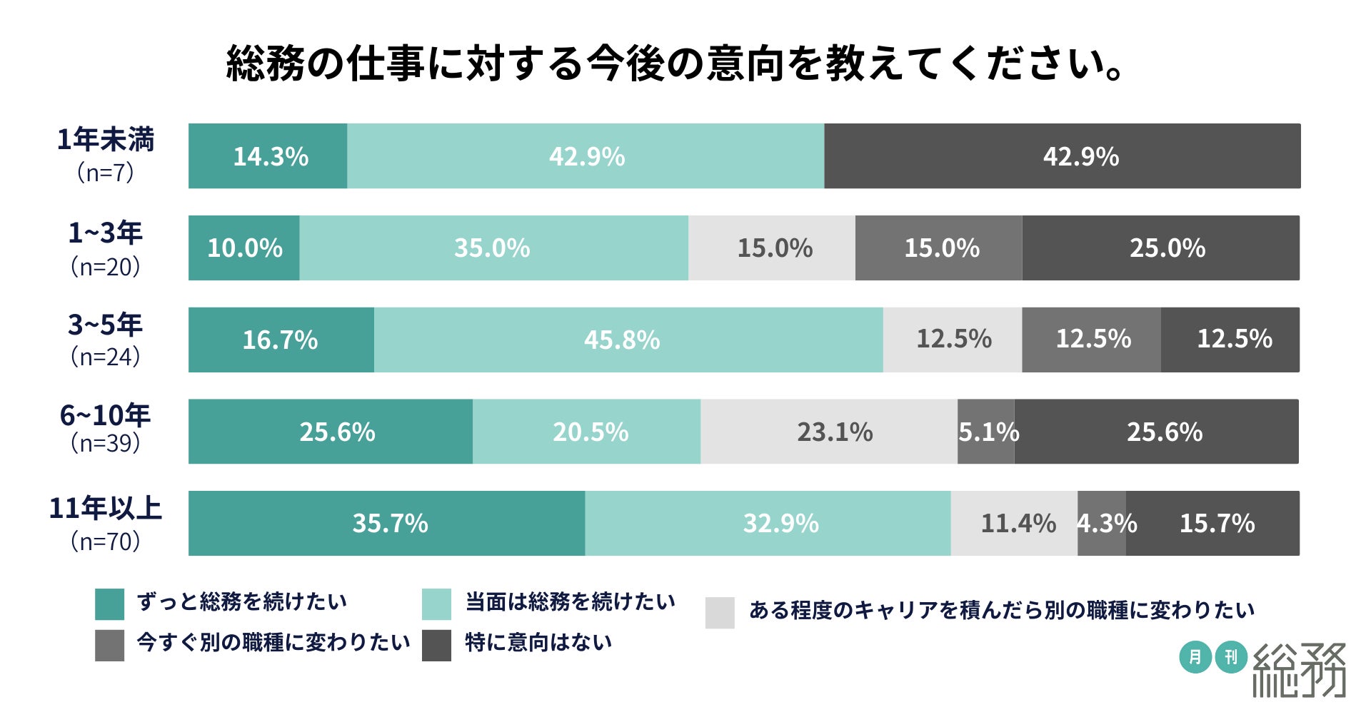 ・総務経験年数が長いほど「ずっと総務を続けたい」と答える割合が増加