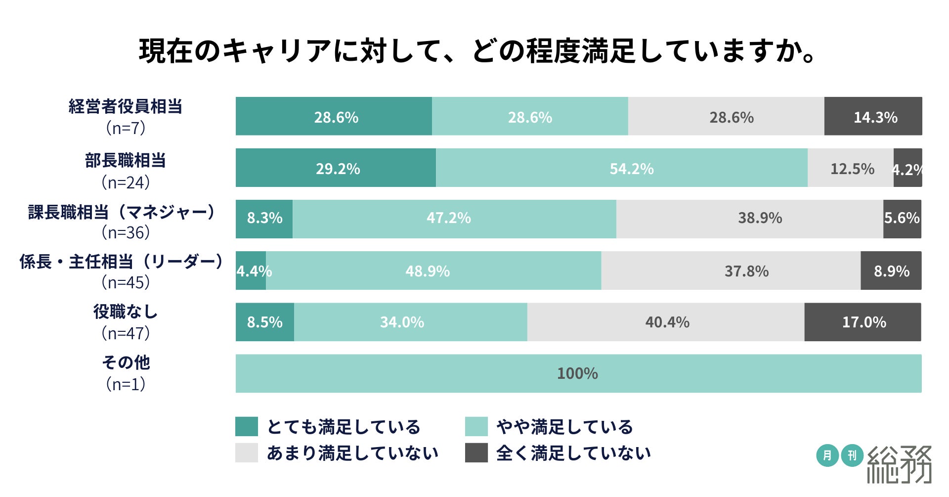 また、役職が高いほど現在のキャリアに対する満足度が高い傾向が見られました(n=160)。
