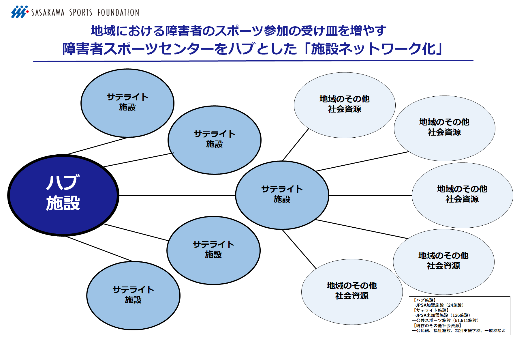 施設ネットワークは、障害者のスポーツとの出会いの場の拡充と、障害者のスポーツ活動の多様化の実現につながる。ハブ施設、サテライト施設、地域のその他社会資源が地域単位で連携し、提供する事業・サービスのすみ分けを行うことで、障害の種類や程度、活動の目的などが異なる障害者の多様なニーズへの対応が可能となる。