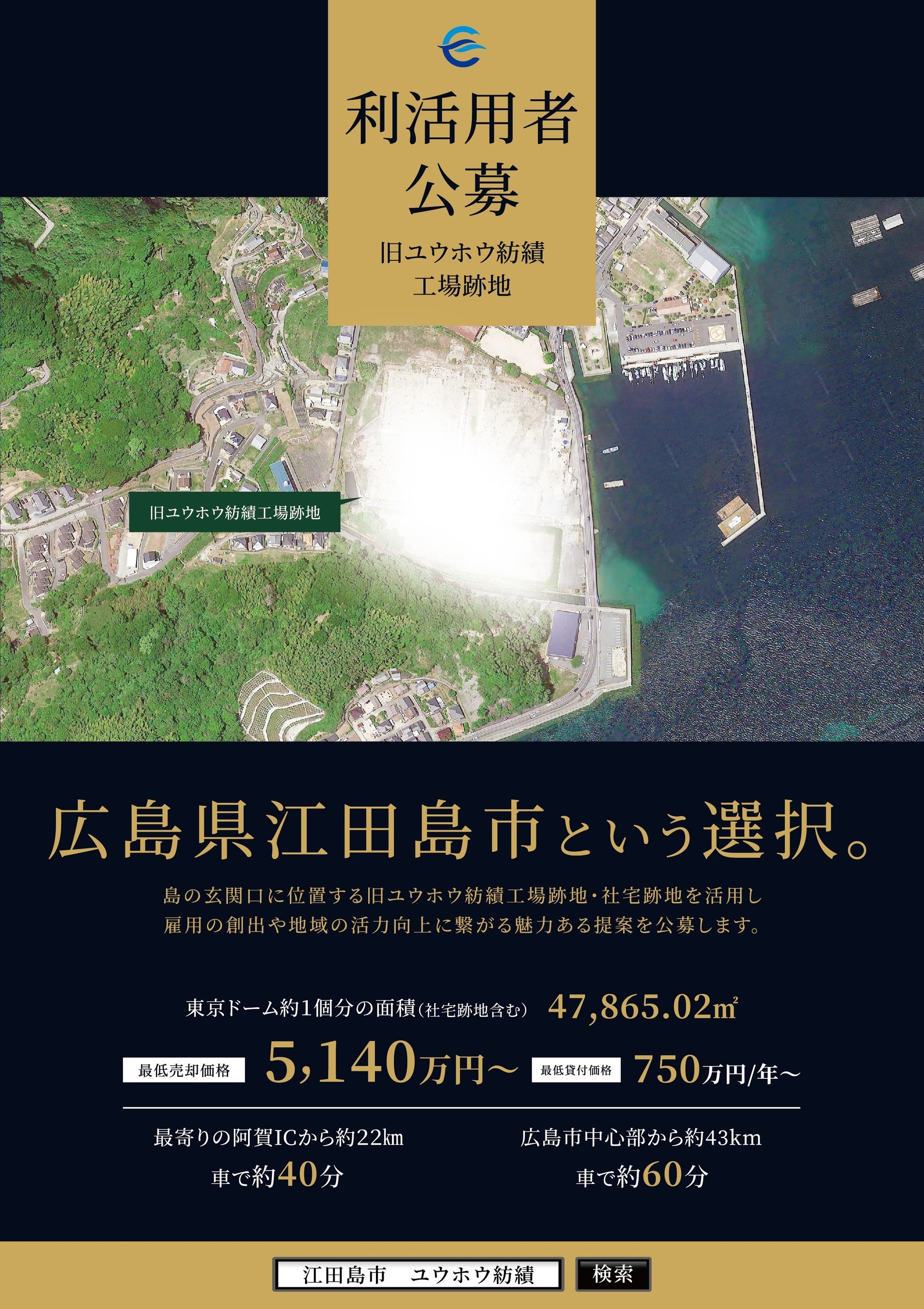呉市と江田島市を結ぶ、早瀬大橋から車で約5分の位置にある旧ユウホウ紡績工場跡地は、社宅跡地を含め47,865.02㎡、東京ドーム約1つ分にあたる広大な土地です。跡地の周りには「江田島オリーブファクトリ―」をはじめとした人気観光施設もいくつか点在しており、さまざまな方面から魅力ある提案を公募しています。