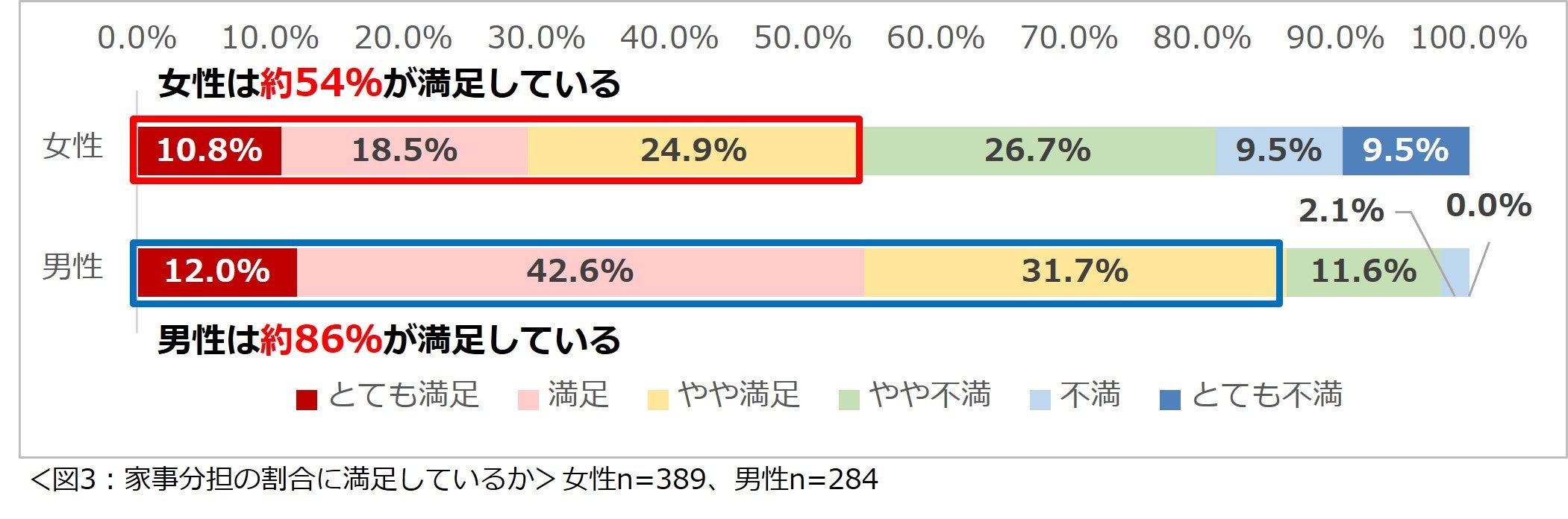 家事分担の割合に対して、男性の約86%が満足も、女性は約54%まで下がる。