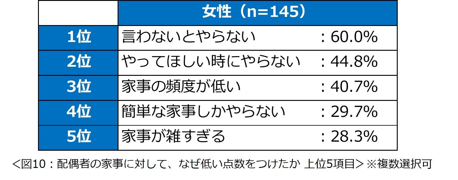 配偶者の家事に低い点数を付けた女性の理由1位は「言わないとやらない」で6割。
