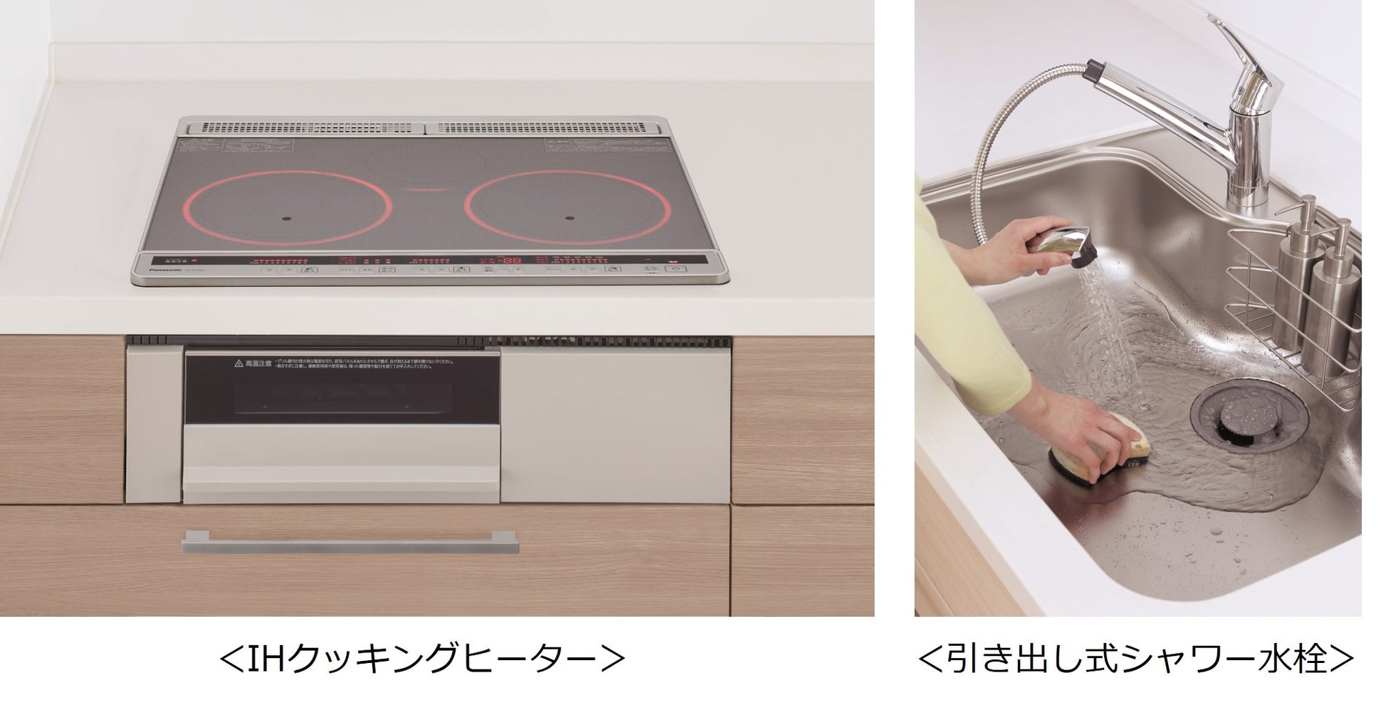IHクッキングヒーターは凹凸がない天板のため、吹きこぼれても、拭くだけでいつも美しく清潔に保つことができます。便利な引き出し式シャワー水栓は、ワンタッチで、シャワー/ストレートの切り替えが可能です。