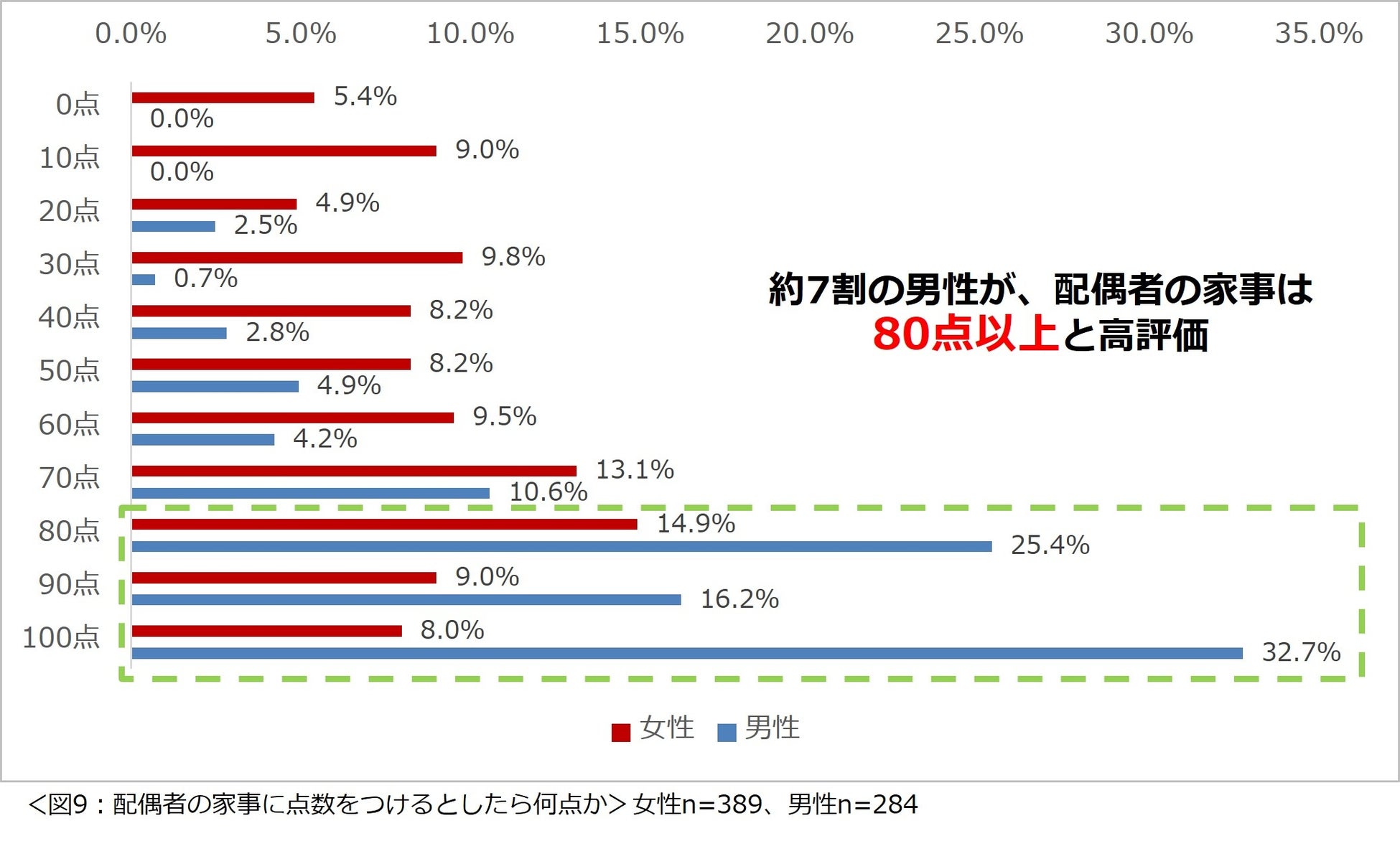 配偶者の家事に点数をつけるとしたら80点以上と回答した人が、男性では約7割。