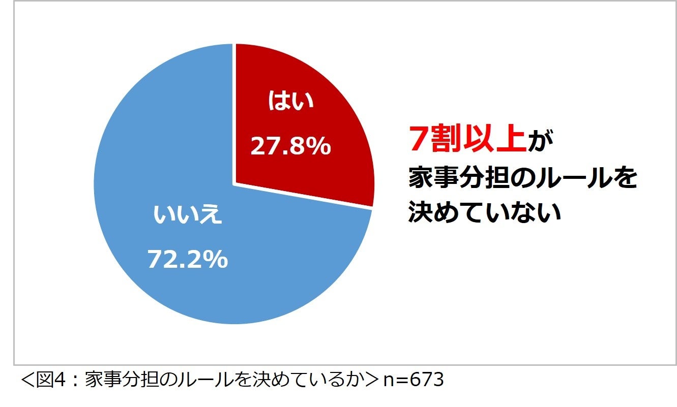 「家事分担のルールを決めていますか?」と尋ねたところ、ルールを決めているという夫婦は27.8%で、7割以上の夫婦はルールを決めていないことがわかりました。(図4)