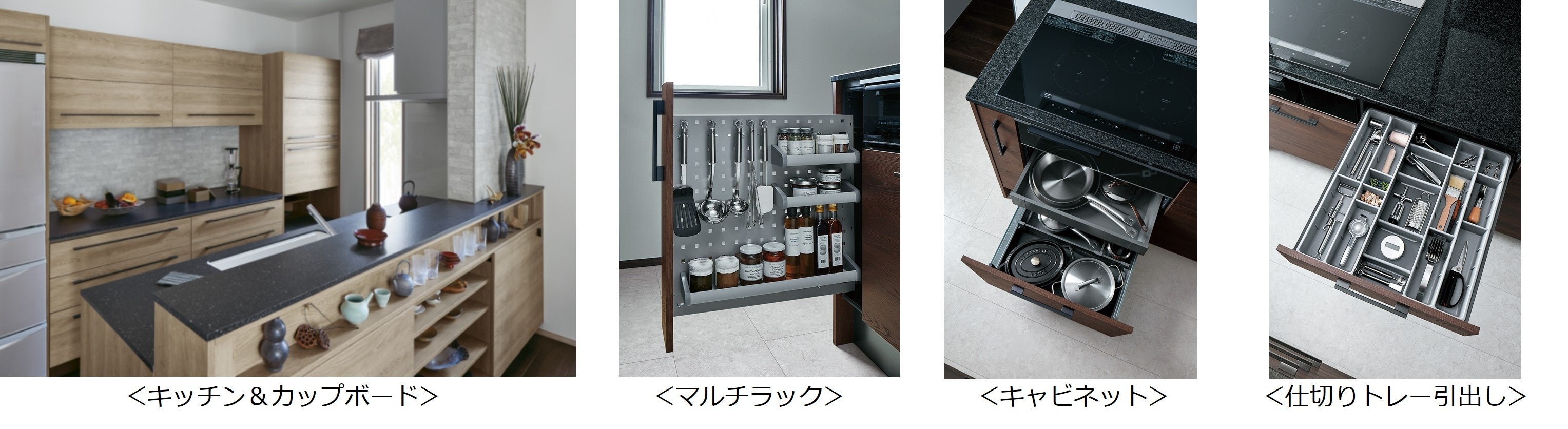 広々としたキッチン&カップボードで、一時置きや盛り付けも余裕のあるスペースで行えるため調理の効率がアップします。また、大きなキッチン道具も十分仕舞える収納力を備え、必要な調味料や調理器具、食器など、ほしいときにほしいものがすぐ取れるよう、引出し内部にもたくさんの工夫があります。