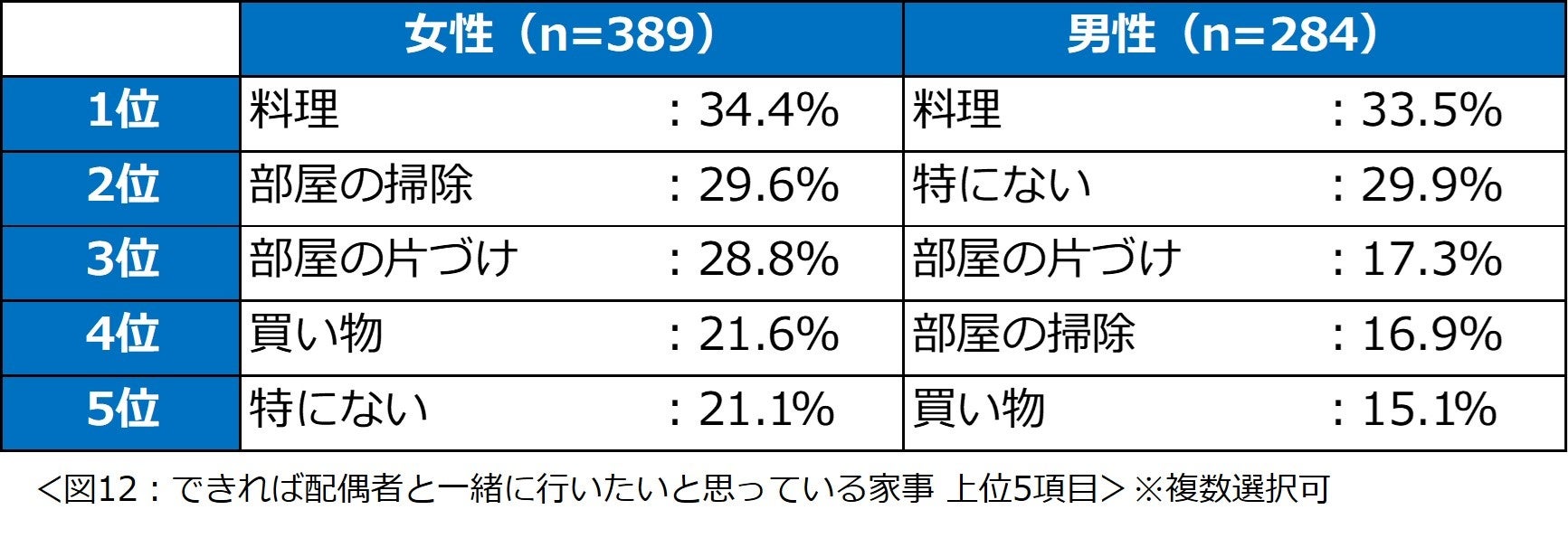 「できれば配偶者と一緒に行いたいと思っている家事は何ですか?」と尋ねたところ、男女ともに「料理」という回答が最も多く、3割以上となりました。(図12)
