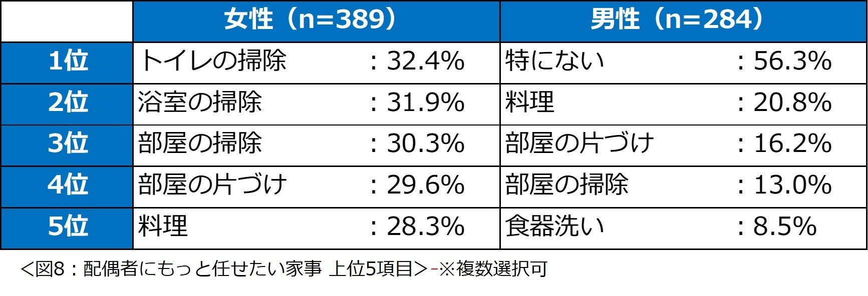 「配偶者にもっと任せたい家事は何ですか?」と尋ねたところ、女性の回答1位は「トイレの掃除」、2位「浴室の掃除」、3位「部屋の掃除」でした。一方、男性は「特にない」が最多で半数以上となりました。(図8)