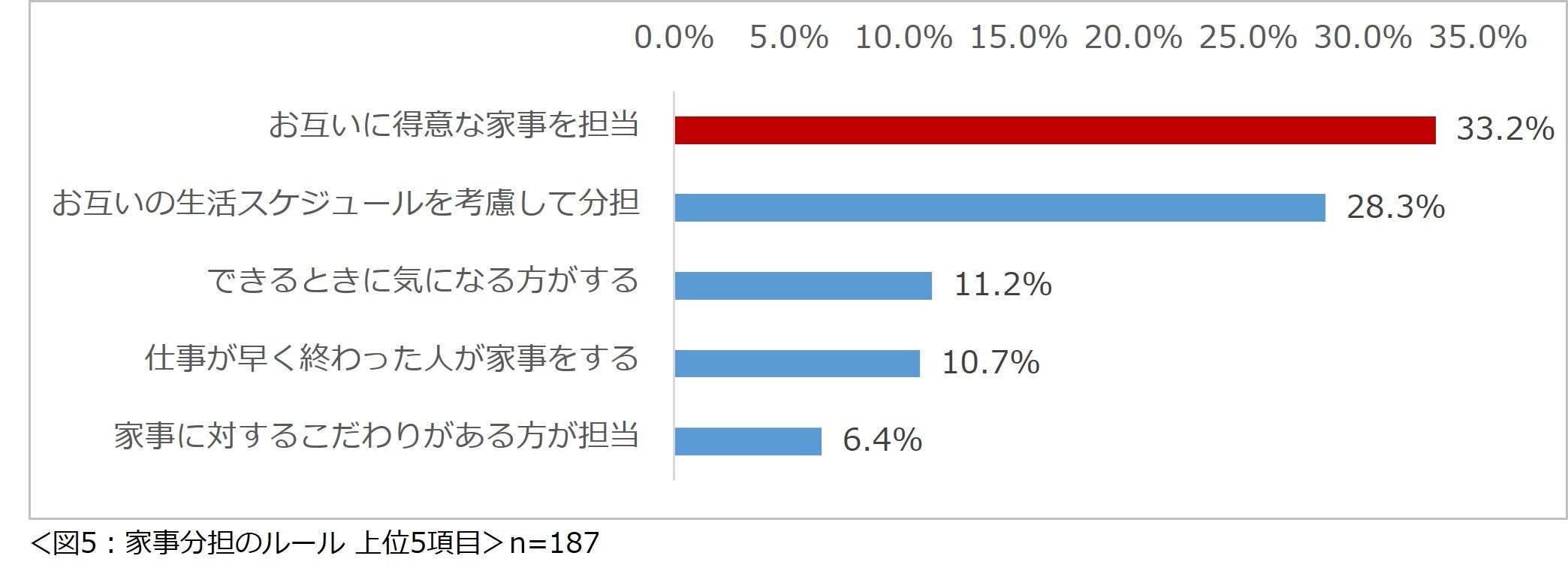 家事分担のルールを決めていると回答した187名に「どのようなルールですか?」と尋ねたところ、「お互いに得意な家事を担当」という回答が最も多く、3割以上となりました。(図5)