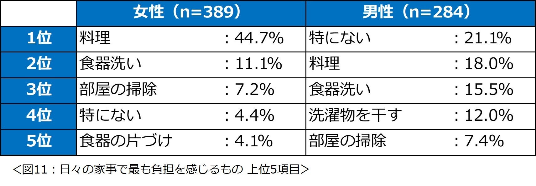 「日々の家事で最も負担を感じるものは何ですか?」と尋ねたところ、女性の回答1位は「料理」で4割以上、男性は「特にない」という回答が最も多い結果となりました。(図11)