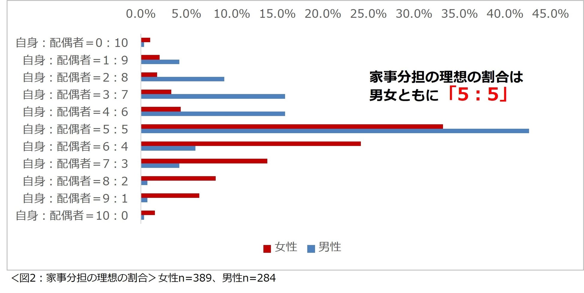 家事分担の理想の割合は男女ともに「5:5」が1位。女性の半数以上は「自身が多めの方が理想」と回答。