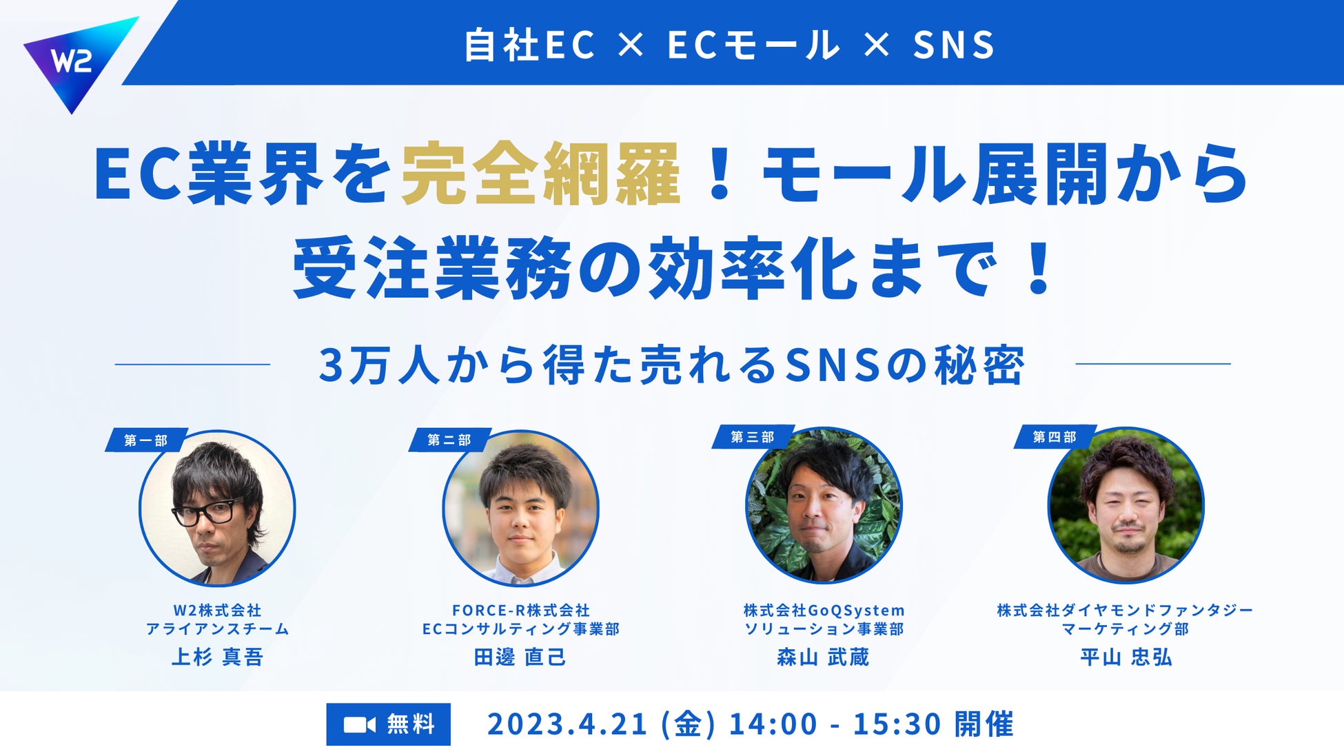 クラウド型通販一元管理システム「GoQSystem」を提供する株式会社GoQSystem(本社:東京都中央区、代表:藤本 卓治)は、W2株式会社・FORCE-R株式会社・株式会社ダイヤモンドファンタジーとの共催セミナー「【自社EC×ECモール×SNS】EC業界を完全網羅!モール展開から受注業務の効率化まで!~3万人から得た売れるSNSの秘密~」を4/21(金)にオンラインにて開催いたします。