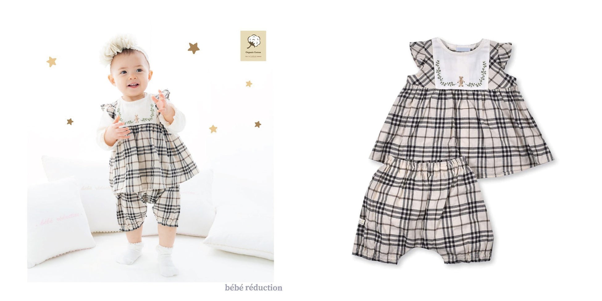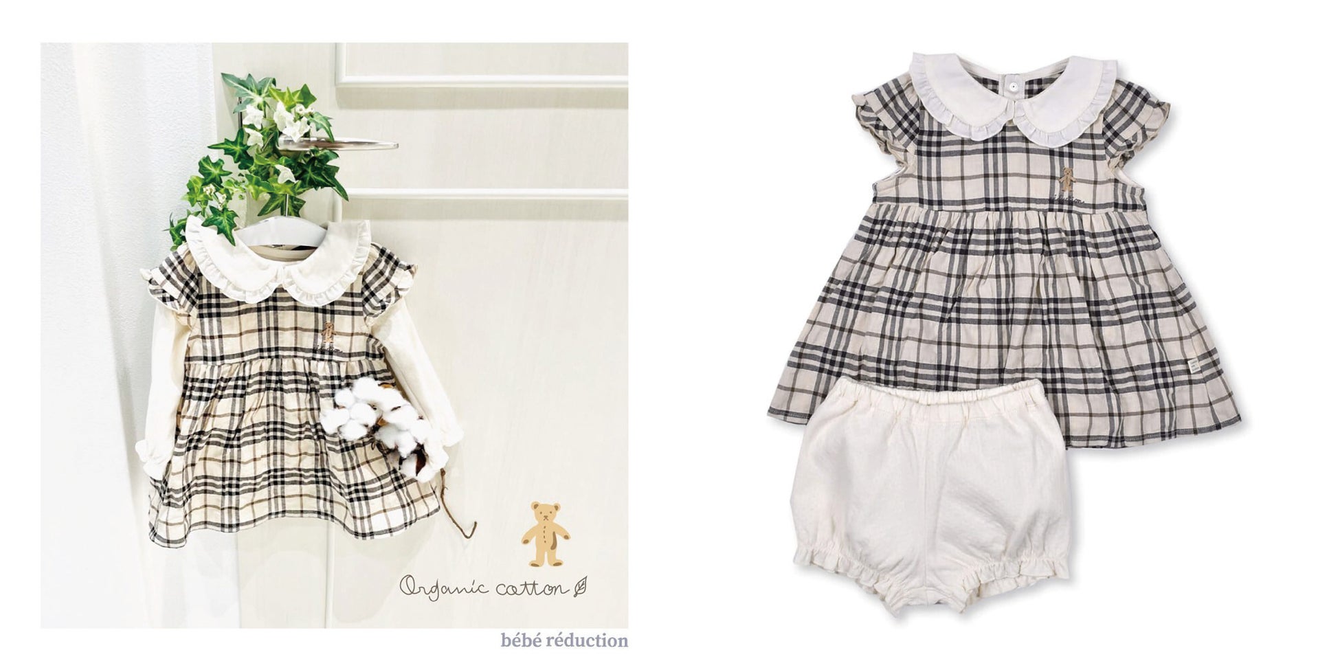 くまさんプリントとチェックの縁取りがキュートなスタイです。