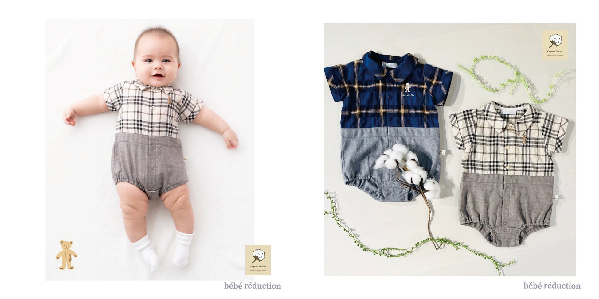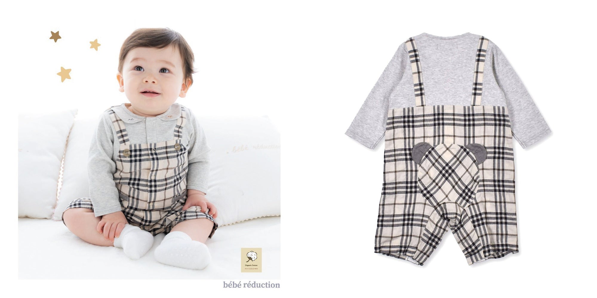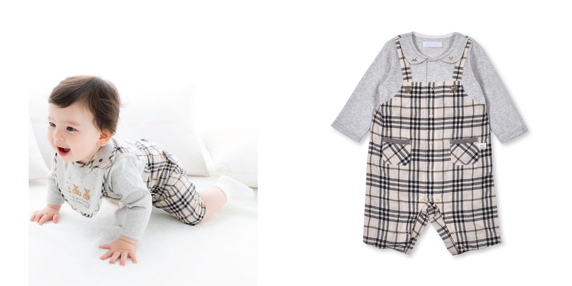 チェック柄のロンパースを重ね着している様に見えるトロンプルイユのカバーオール。