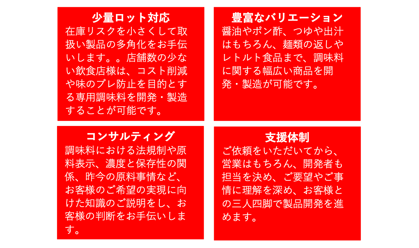 「少量ロット対応」「豊富なバリエーション」「コンサルティング」「支援体制」を軸に、歴史に裏付けされた技術力と、豊かな開発力で食品業界の味づくりを支えます