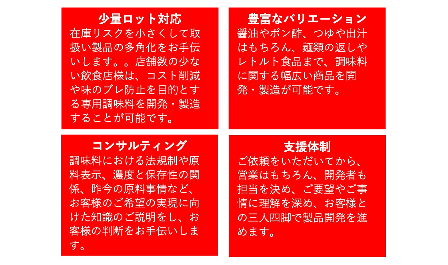 【豊かな開発力でめんつゆから特定メニュー専用品まで。食品に関するあらゆる業態に対応】