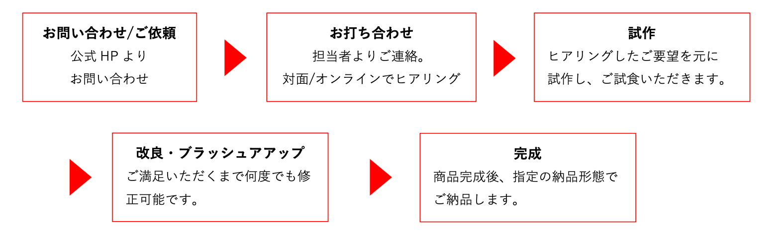 当社では10年以上にわたって様々な企業様の製品づくり、味づくりをお手伝いして来ました。特に昨今は原料高・人手不足が叫ばれる中、メーカー様や小売企業様が地産材料や地元の味を組み込まれた製品づくりに当社を利用されたり、外食企業様が当社と試作を繰り返しながら調理の合理化を達成されたり、私達も大変勉強になるお取引を沢山スタートさせて頂いています。企業規模に関わらず、お客様の新しいチャレンジのお手伝いが出来る様に日々研鑽を続けています。皆様からのご連絡ご相談をお待ちしております。