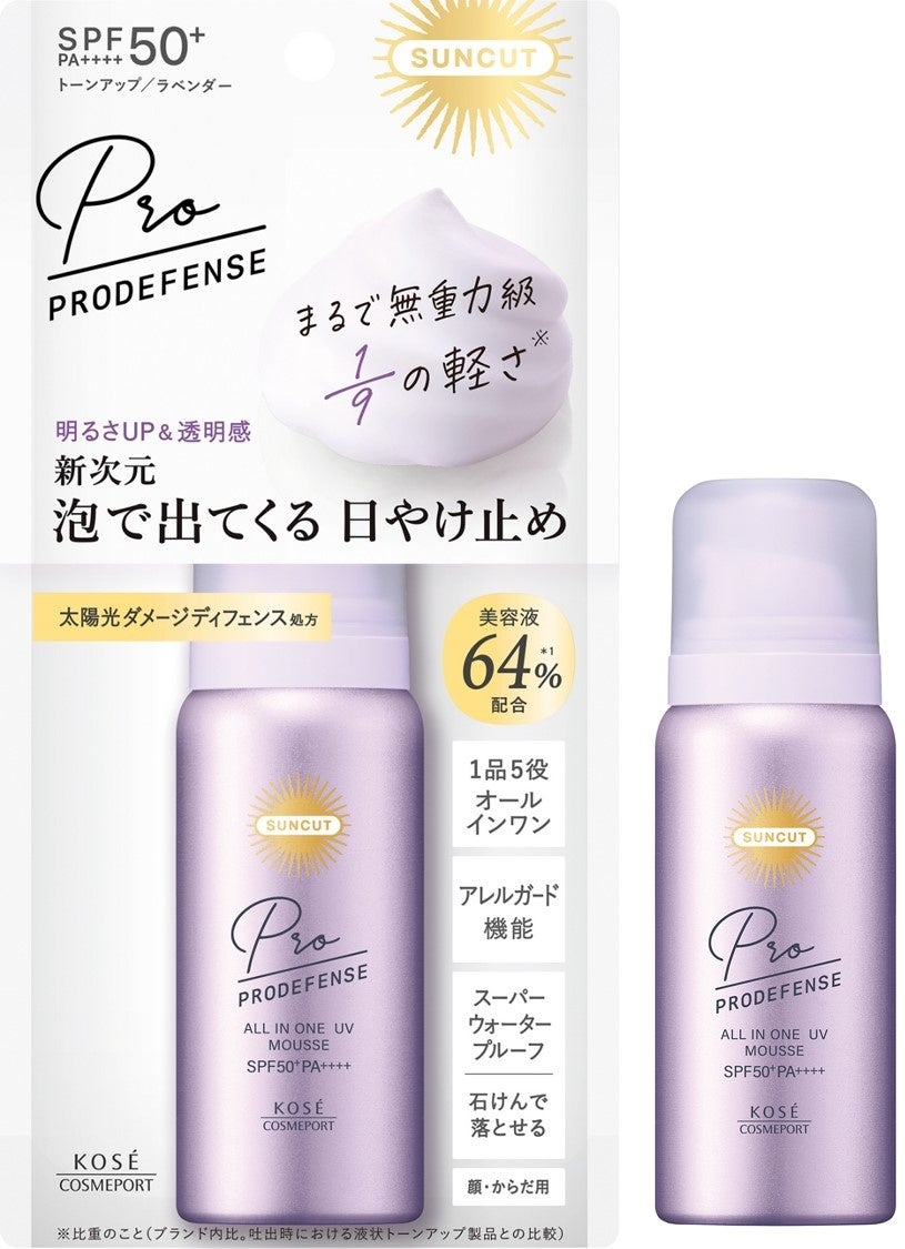 今回「プロディフェンス」シリーズから追加発売する「オールインワン UVムース」は、 1品で5つ(日やけ止め、トーンアップ、美容液、化粧下地、アレルガード機能※3)の機能を兼ね備え、泡状で吐出される日やけ止めです。ふわっと軽いミクロ泡が、肌への塗布時にムラなく広がり、素早く薄膜を形成します。国内基準最高値のUVカット指数(SPF50+/PA++++)で、汗・水・皮脂に強い耐久性に優れたスーパーウォータープルーフタイプでありながら、石けんで簡単に落とすことができます。トーンアップパール※4配合のラベンダーカラーにより、肌に透明感と血色感を与えます。また、美容液を64%※5の「太陽光ダメージディフェンス処方」を採用、うるおいあふれる明るい素肌へ導き、紫外線ダメージから肌を守ります。さらに、化粧くずれを防ぎマスクにもつきにくい、化粧もちUP成分※6を配合、花粉・ちり・ほこり・PM2.5などをブロックスするアレルガード機能も搭載しています。無鉱物油・パラベンフリー・フレッシュフローラルの香りです。
