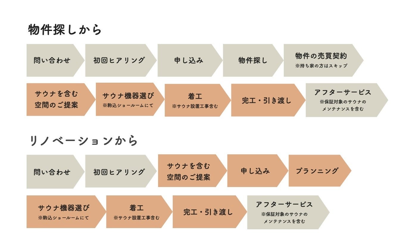 本サービスでは、リノベーション設計時に「HARVIA」のインドアサウナ商品をお選びいただけます。物件探しからスタートの場合、リノベーション設計のみの場合、どちらも対応しております。