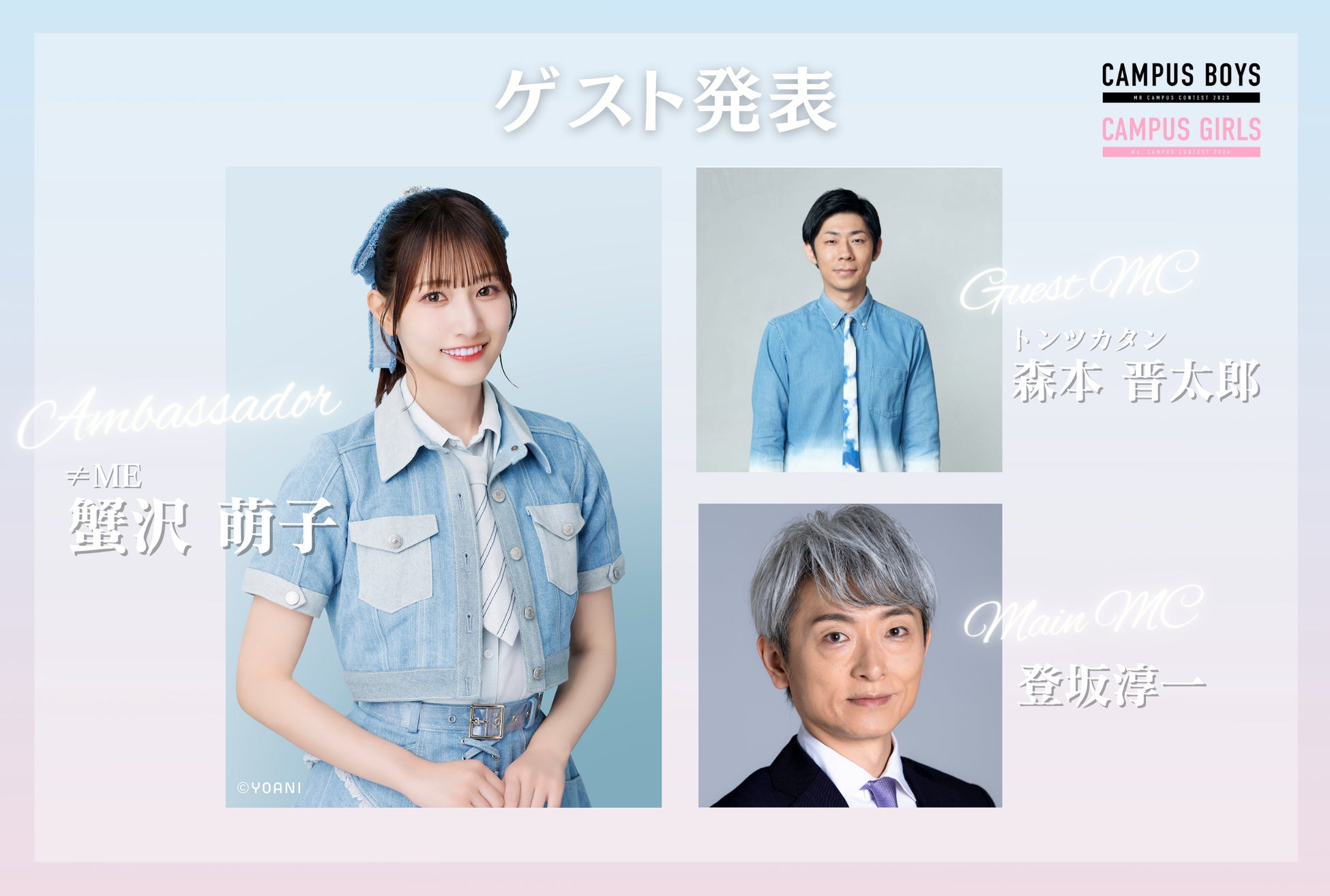 3/26(水)日本最大級キャンパスミス/ミスターコン「CAMPUS BOYS 2025」「CAMPUS GIRLS 2025」授賞式開催決定!ゲストは≠ME 蟹沢萌子・トンツカタン森本、司会は登坂淳一