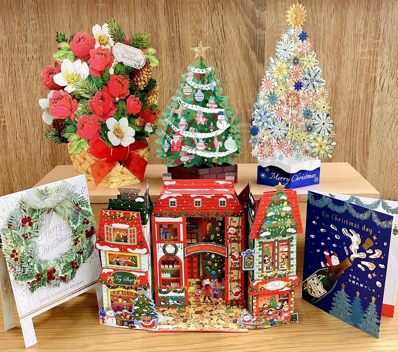 手軽な季節のインテリアとしても人気がある立てて飾れるタイプの立体カード。特にツリー型カードは、贈るのはもちろん手軽な自宅用ミニチュアツリーとしても人気です。