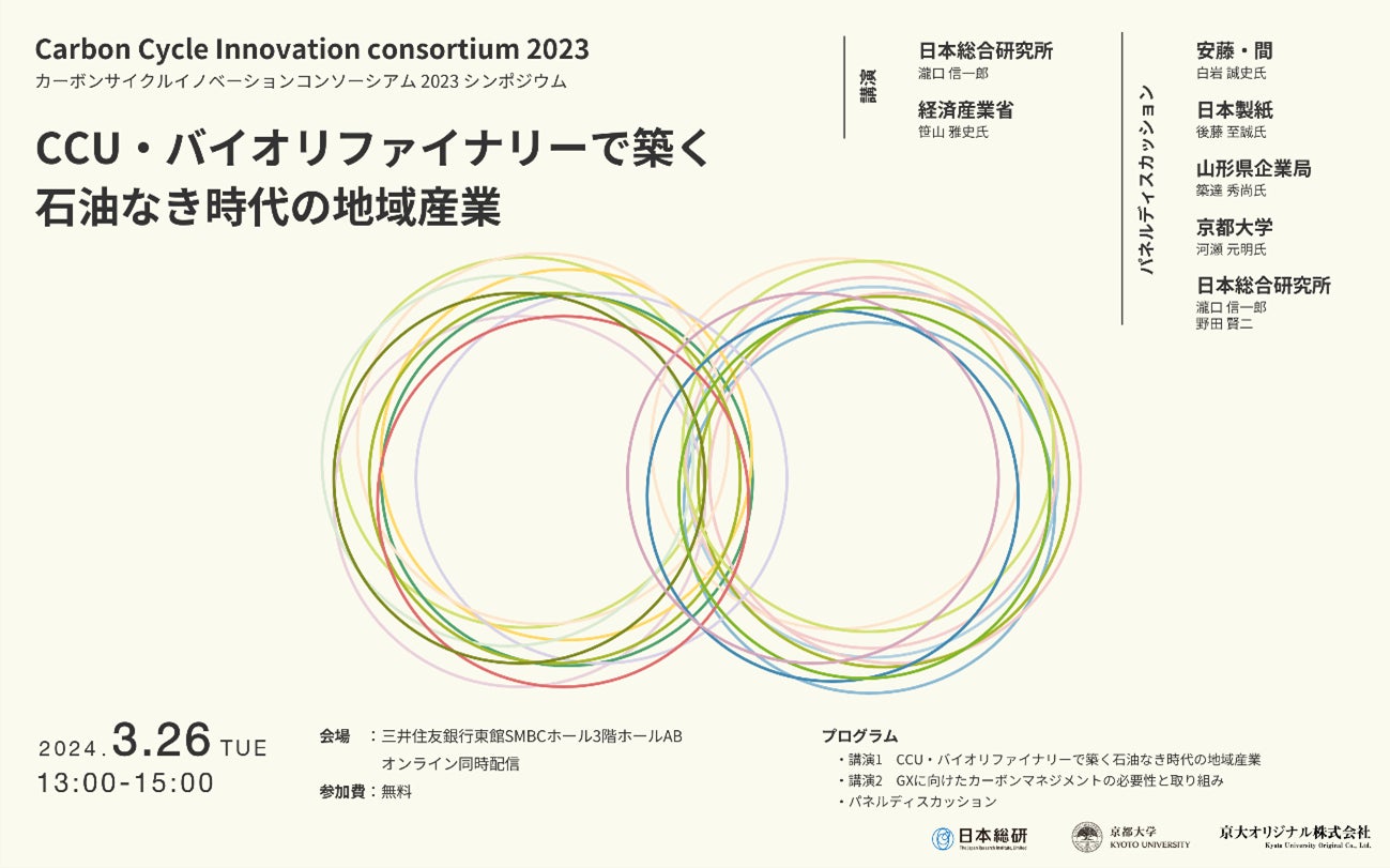 株式会社日本総合研究所(本社:東京都品川区、代表取締役社長:谷崎勝教、以下「日本総研」 )は、国立大学法人京都大学(所在地:京都府京都市、総長:湊長博、以下「京都大学」)、京大オリジナル株式会社(本社:京都府京都市、代表取締役社長:山田幸男、以下「京大オリジナル」 )とともに、「CCU・バイオリファイナリーで築く石油なき時代の地域産業~カーボンサイクルイノベーションコンソーシアム2023シンポジウム~」を2024年3月26日に三井住友銀行東館SMBCホールで開催します。