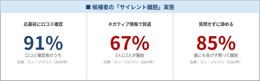 さらに深刻なのが、候補者側の「静かな離脱」です。就活生の68.6%がタイパ(タイムパフォーマンス)を意識して情報を取捨選択し(マイナビ2026卒調査)、新卒の86.1%・中途の50%が応募前に口コミを確認。そのうち91%が「エントリー前」に確認しており、ネガティブな情報を見た候補者の67%がエントリーを取りやめています(エン・ジャパン2024年調査)。