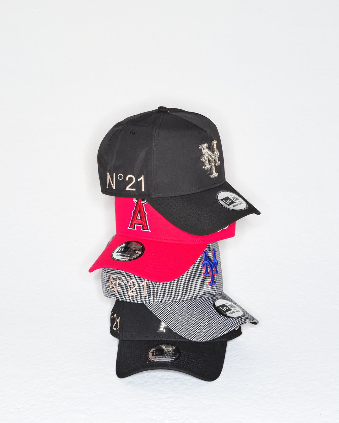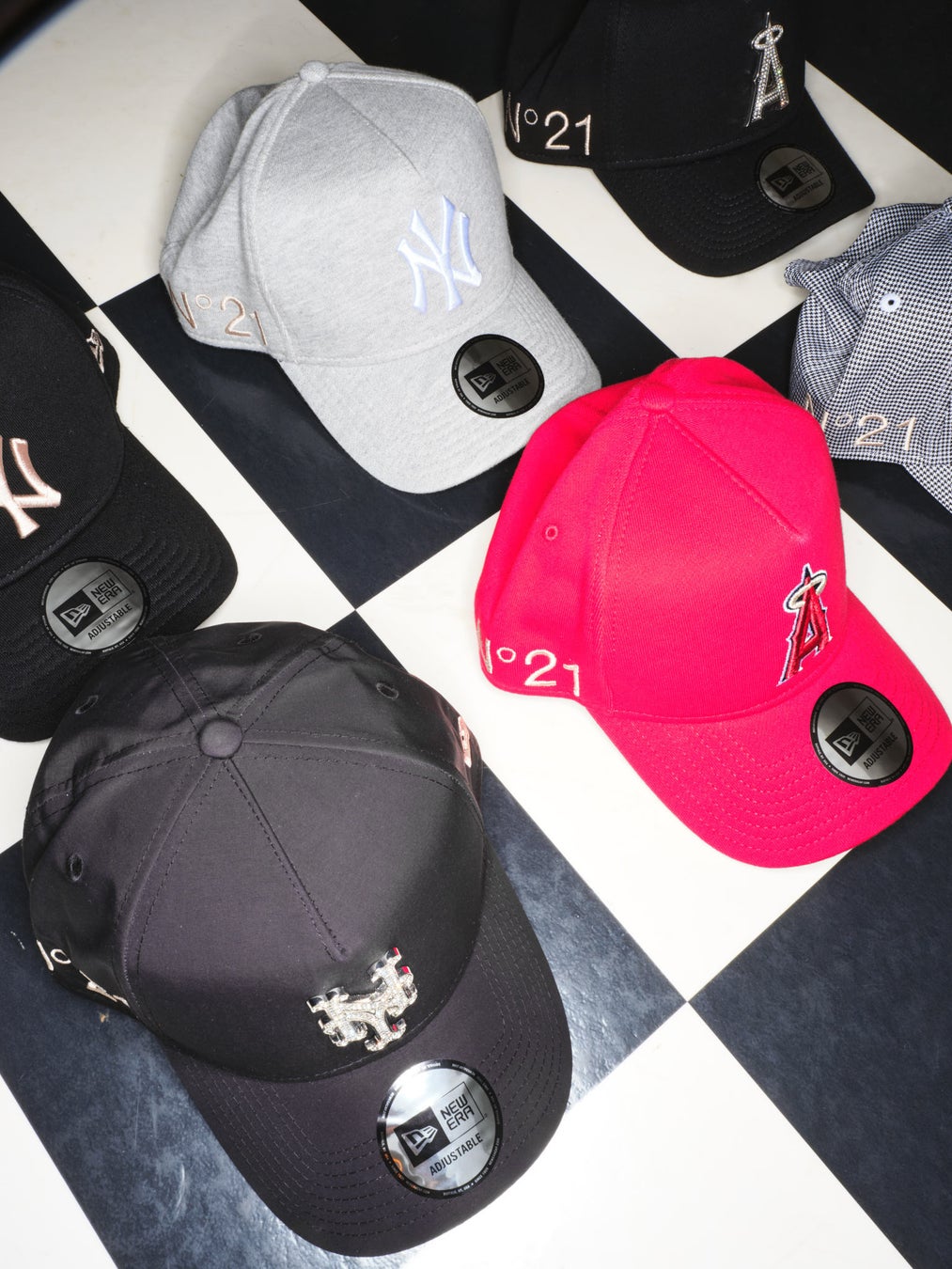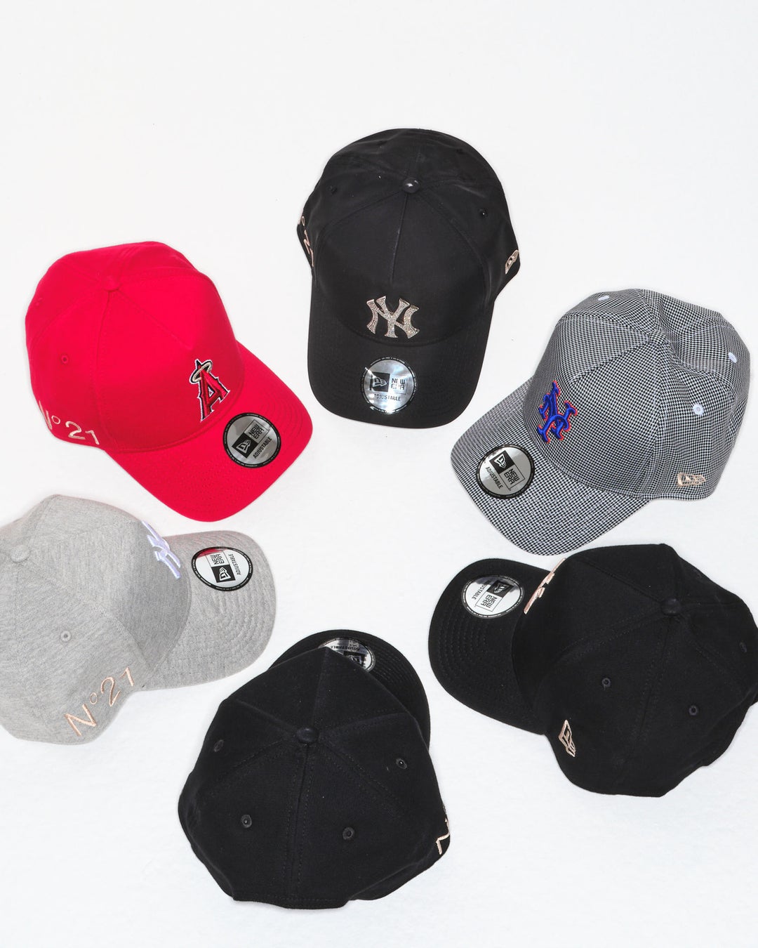 ロサンゼルス・エンゼルス(Los Angeles Angels)、ニューヨーク・ヤンキース(New York Yankees)、ニューヨーク・メッツ(New York Mets )の3球団のキャップに、N21のロゴをオン。クリスタルのラインストーンを施した華やかなデザインから、やわらかなかぶり心地を叶えたスエット生地のデザインまで、夏のレジャーにもぴったりな洗練されたファッションアイテムが揃いました。N21のロゴは、ブランドカラーであるチプリア(ピンクベージュ)のお色味で刺繍を施しています。