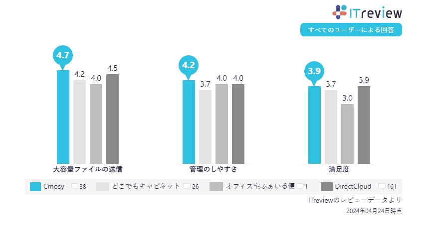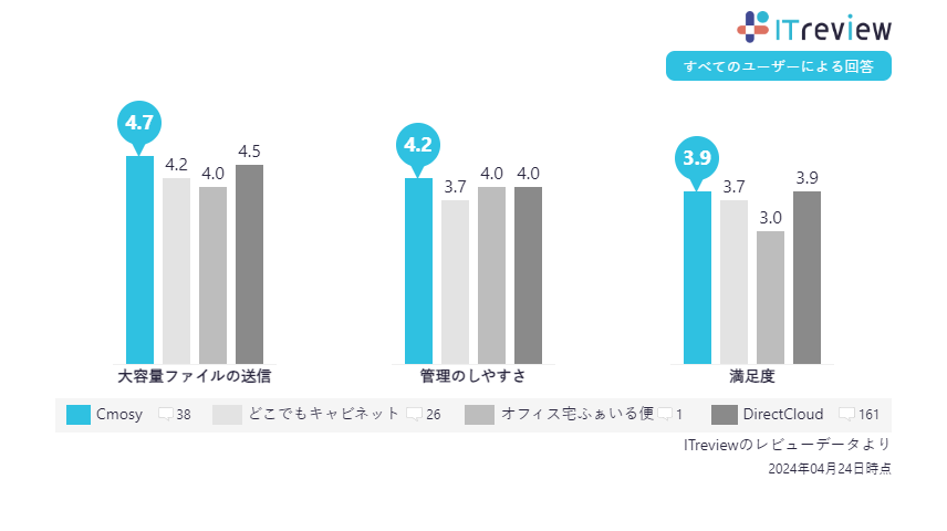 おかげさまで、Cmosy(クモシィ)は、「大容量ファイルの送受信」「管理のしやすさ」でご好評をいただいており、お客様満足度3.9(5.0点満点中)をいただいております。(2024年4月24日時点)