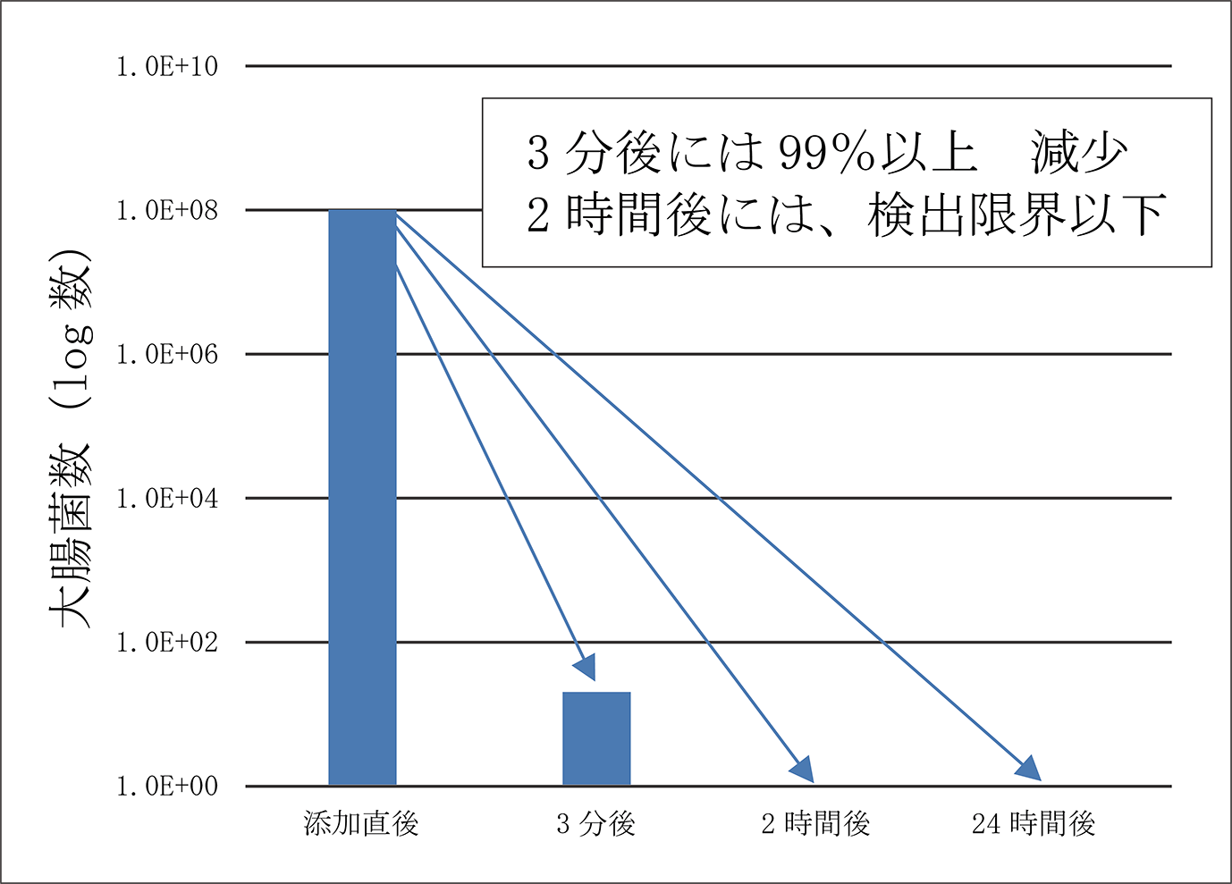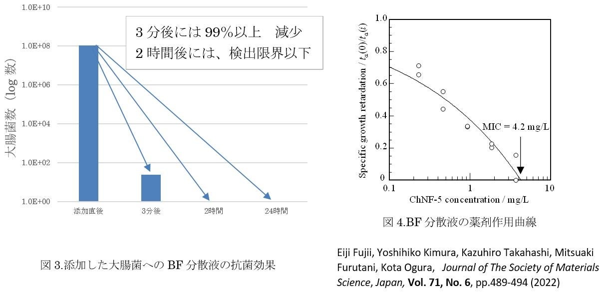 図3に示すように、BF分散液に接種した大腸菌は、3分後には検出限界以下の菌数まで減少しました。また、一定時間ごとにBF分散液に大腸菌を追加接種した場合も24時間後には検出限界まで菌数が減少しました。
