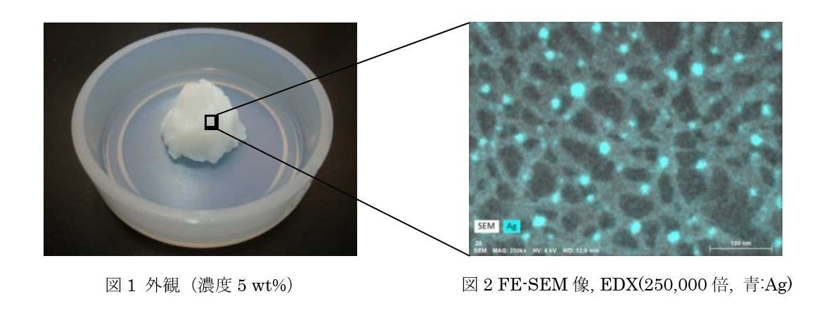 「BiNFi-s/銀ナノ粒子」は、バイオマス原料であるセルロースやキトサンをナノファイバー化したBiNFi-sの繊維上に、ナノサイズの銀粒子を担持させた製品です。きわめて微細な銀ナノ粒子(直径2~20 nm)が分散した状態で析出しているのが特徴で、図1のようにペースト状で提供しています。