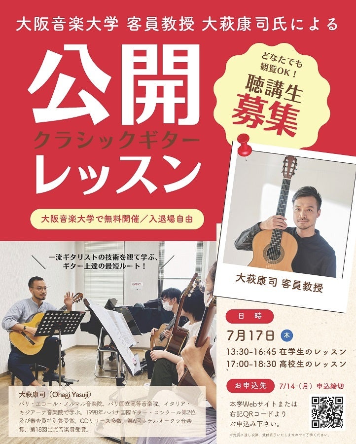 大萩康司 客員教授による「クラシックギター公開レッスン」を開催します。13:30~16:45の時間では本学学生へのレッスン、17:00~18:30の時間では高校生へのレッスンを公開形式で実施します。当日入退場は自由で、どなたでも無料でレッスンを聴講いただけます。クラシックギターに興味がある方はもちろん、大学でのレッスン風景を見てみたい方もぜひお越しください。