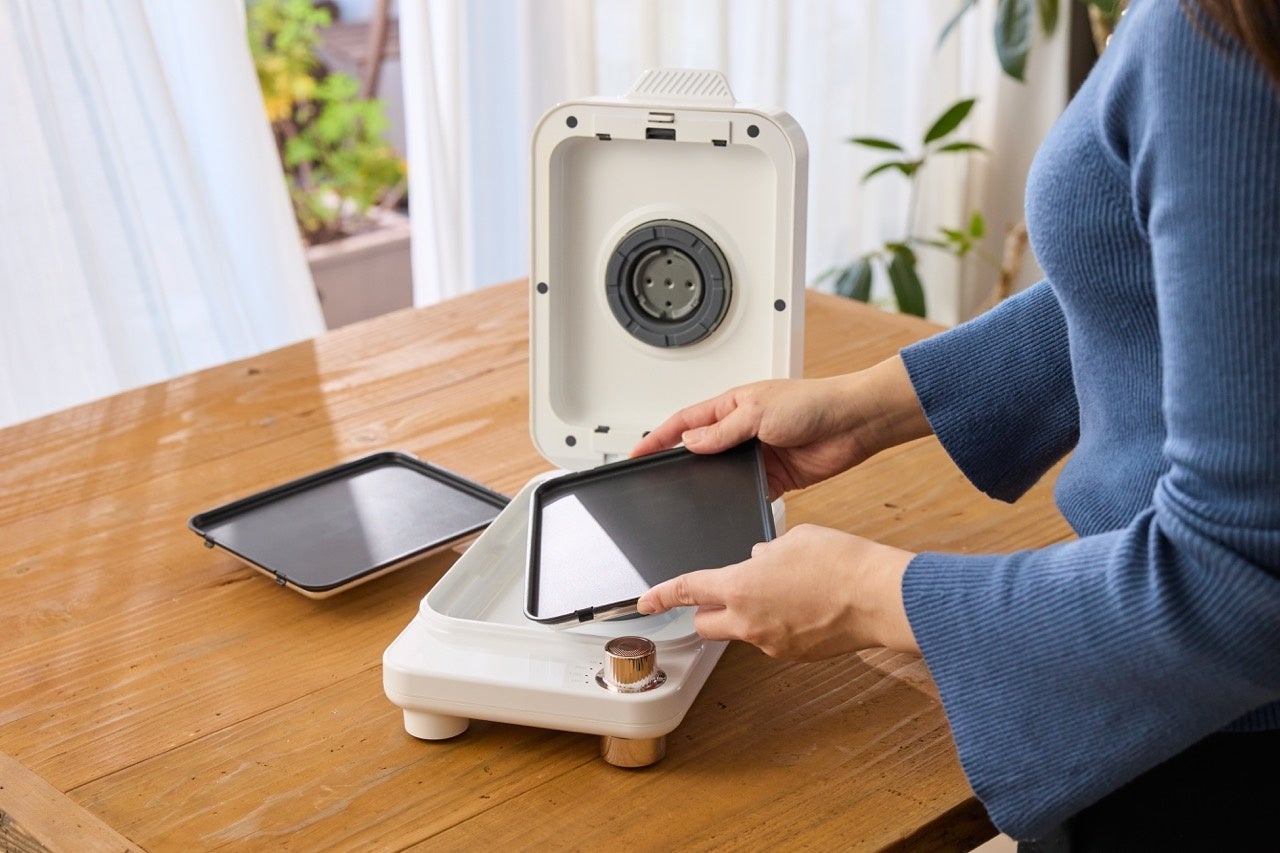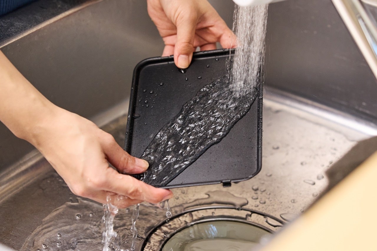 プレートは本体から脱着可能です。トースターでありがちな「パンクズが本体の底に落ちてしまってお手入れがしにくい」といった困り事を解消しました。また、取り外したプレートは丸洗い可能で、食器用洗剤も使用できます。表面のコーティングにより、汚れが落ちやすいように仕上げています。